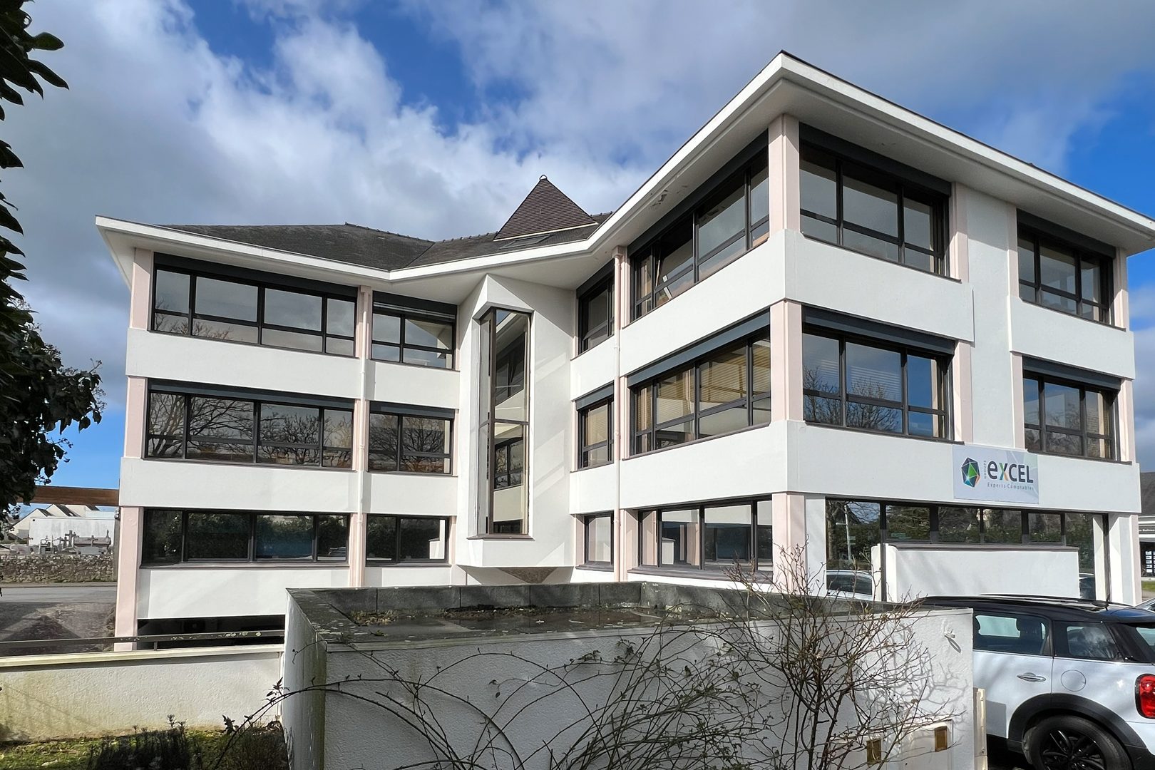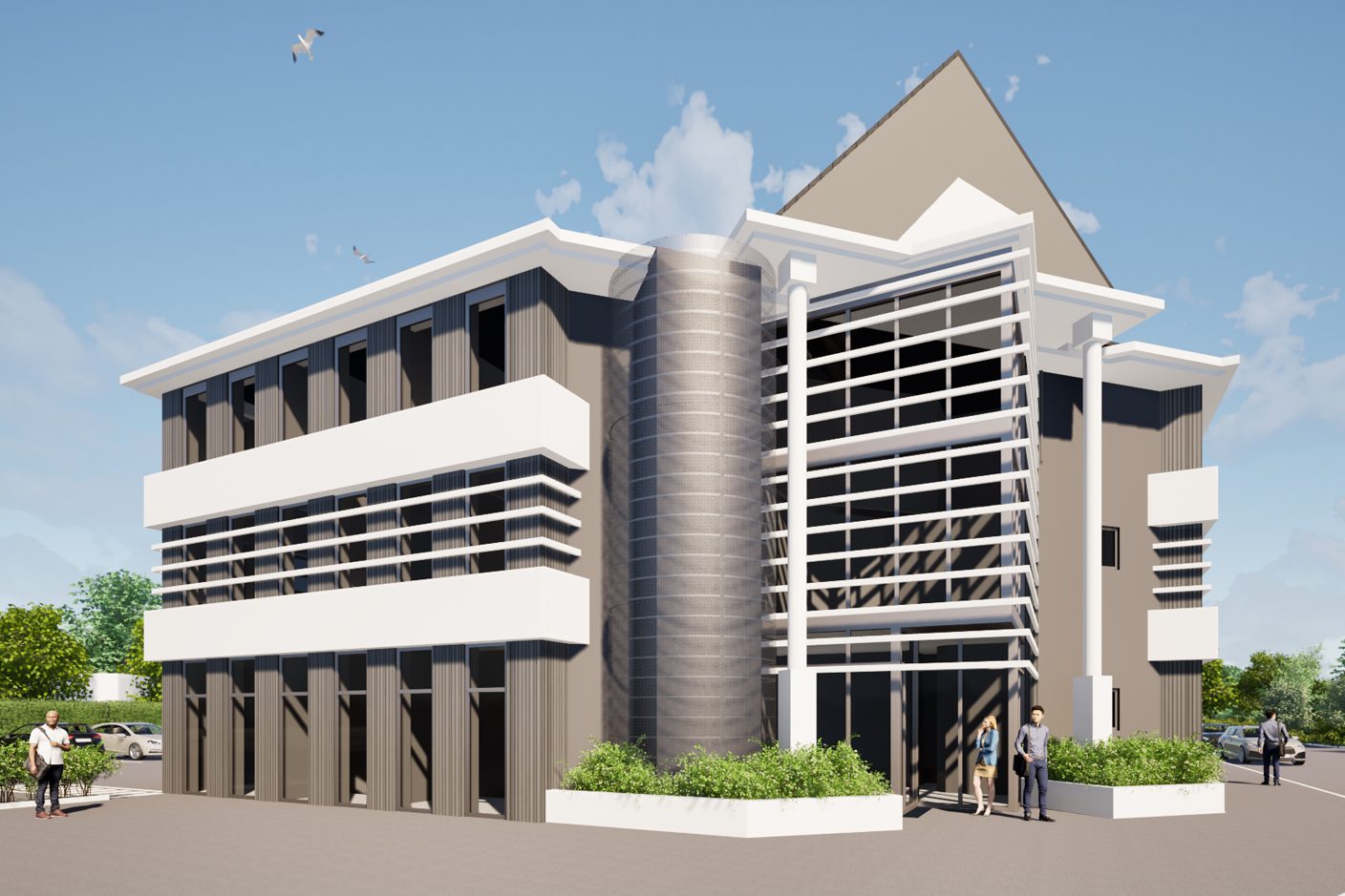 Les façades sont repensées dans une écriture contemporaine, associant sobriété et contraste grâce à l’emploi de deux teintes principales : un gris (RAL 9007) et un blanc (RAL 9010). Des bandeaux épais en enduit blanc rendent lisible la structure des étages courants, ils sont en saillie du reste de la façade. Entre ces bandeaux, le dessin des façades alterne entre des ouvertures toute hauteur et des meneaux en bardage métallique en pose verticale avec des vibrations aléatoires. La répétition des ouvertures permet une modularité des aménagements intérieurs et un ordonnancement architectural des façades. Un jeu de ventelles métalliques blanches vient souligner l’étage noble, marquant ainsi le niveau intermédiaire. L’angle principal est requalifié par l’installation d’un nouveau mur rideau, lui-même rythmé par des ventelles, qui affirme le caractère représentatif du hall. Enfin, un ascenseur est intégré dans un volume habillé d’une résille métallique, apportant une touche contemporaine et légère à la composition.