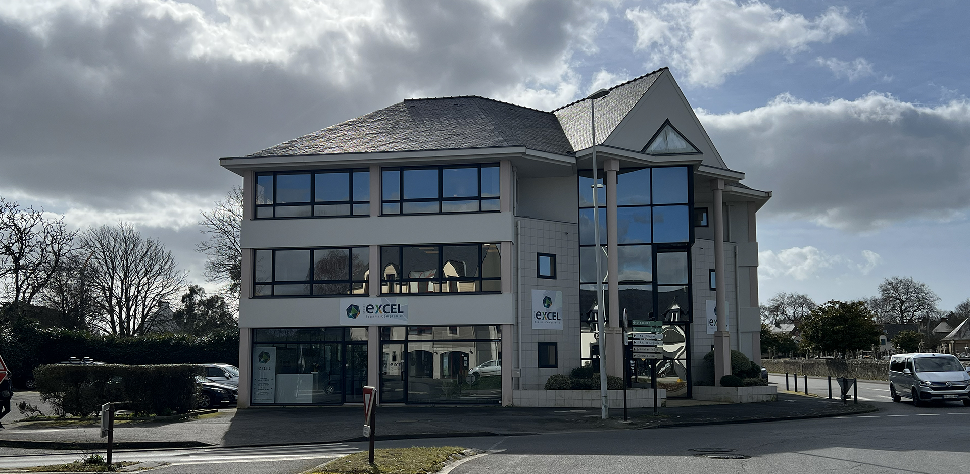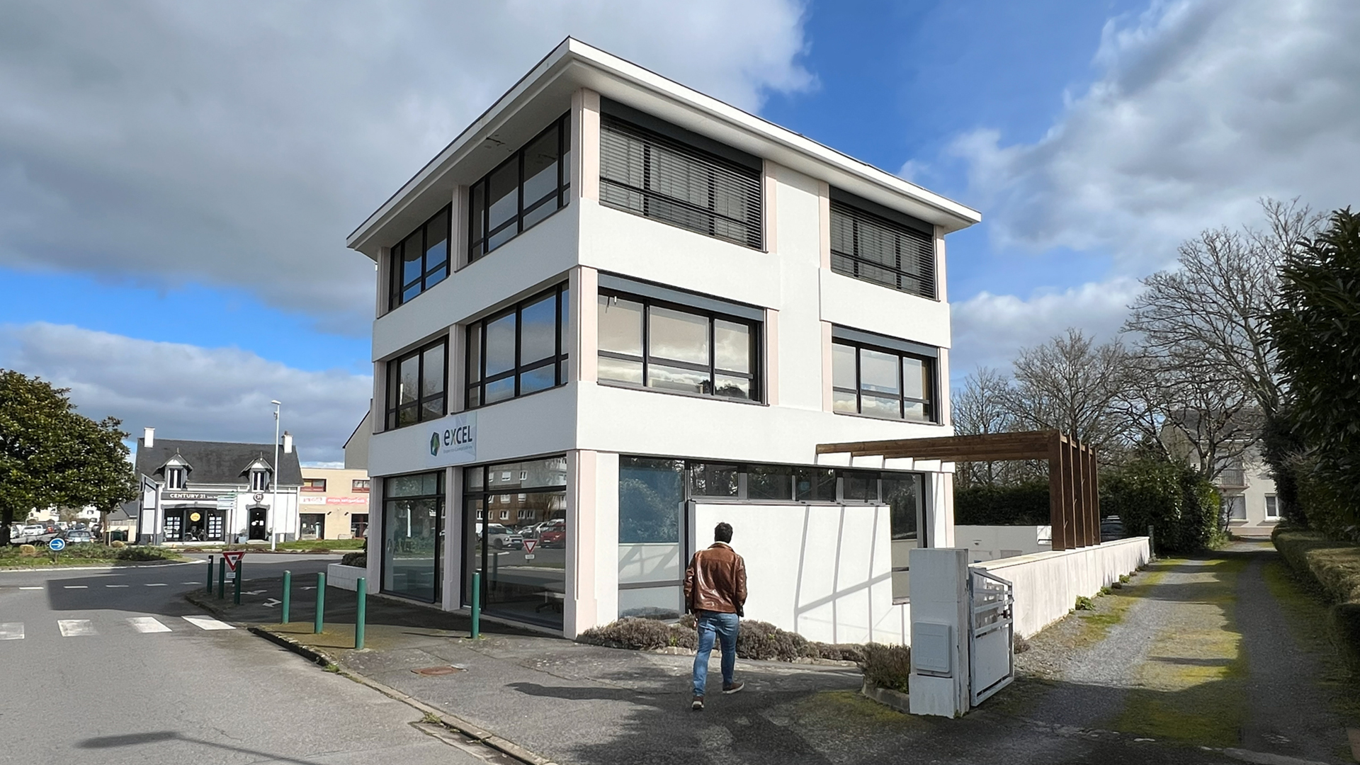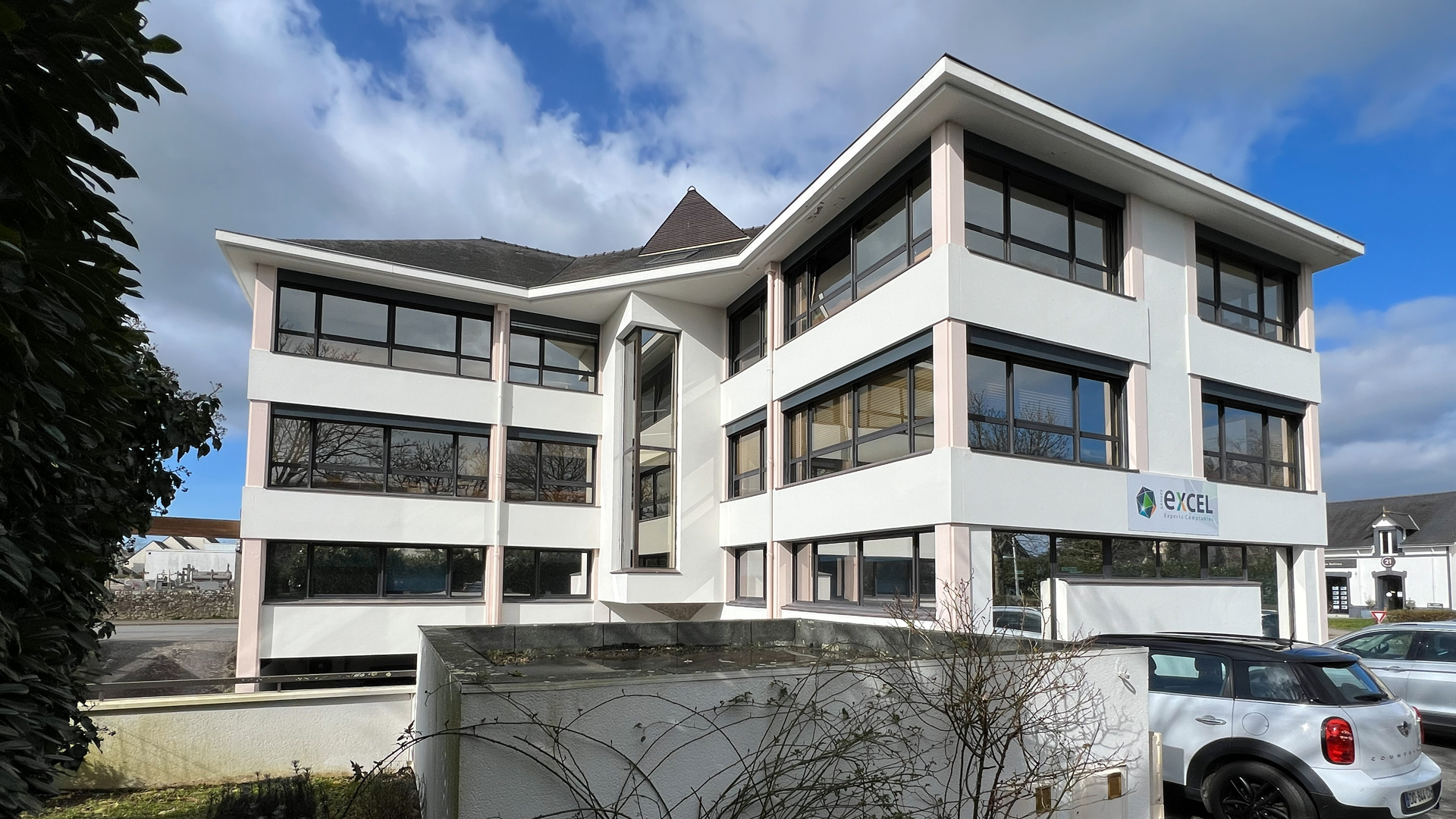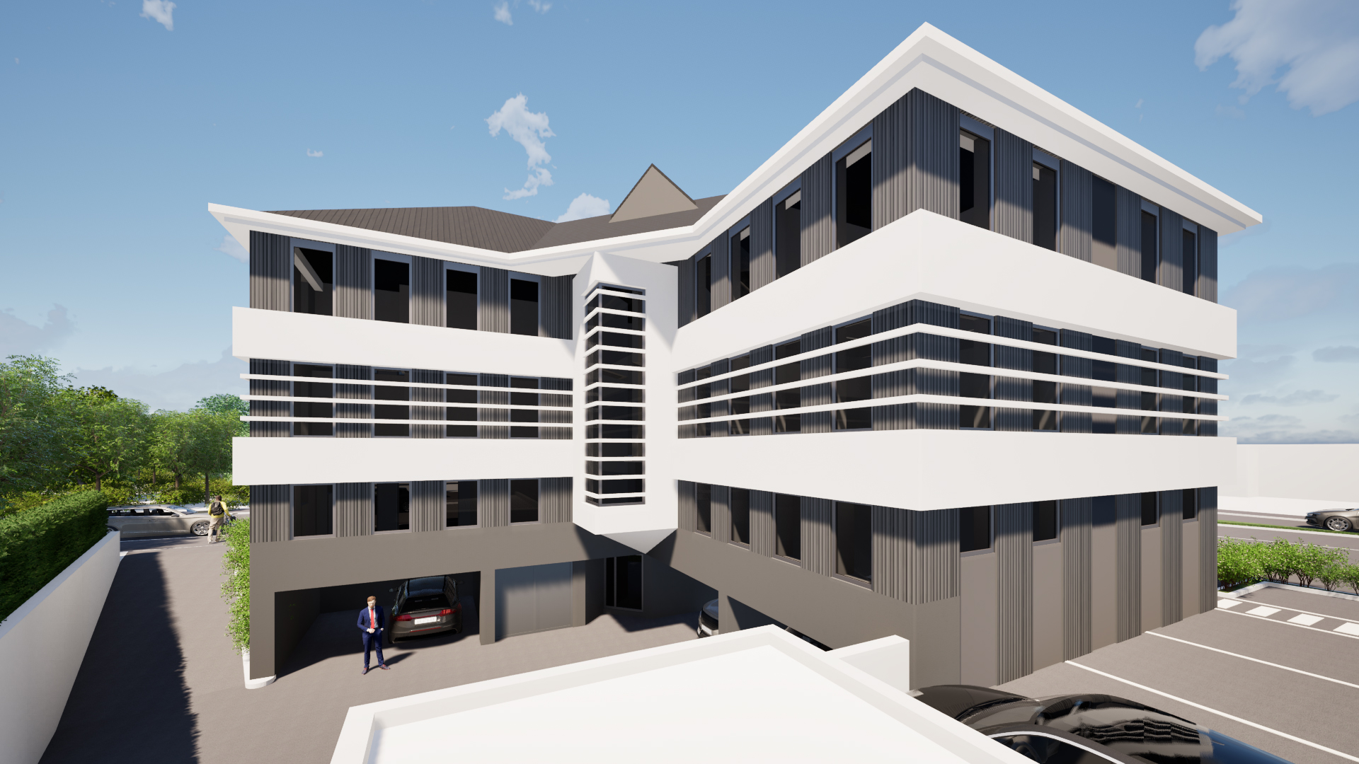 Les façades sont repensées dans une écriture contemporaine, associant sobriété et contraste grâce à l’emploi de deux teintes principales : un gris (RAL 9007) et un blanc (RAL 9010). Des bandeaux épais en enduit blanc rendent lisible la structure des étages courants, ils sont en saillie du reste de la façade. Entre ces bandeaux, le dessin des façades alterne entre des ouvertures toute hauteur et des meneaux en bardage métallique en pose verticale avec des vibrations aléatoires. La répétition des ouvertures permet une modularité des aménagements intérieurs et un ordonnancement architectural des façades. Un jeu de ventelles métalliques blanches vient souligner l’étage noble, marquant ainsi le niveau intermédiaire. L’angle principal est requalifié par l’installation d’un nouveau mur rideau, lui-même rythmé par des ventelles, qui affirme le caractère représentatif du hall. Enfin, un ascenseur est intégré dans un volume habillé d’une résille métallique, apportant une touche contemporaine et légère à la composition.