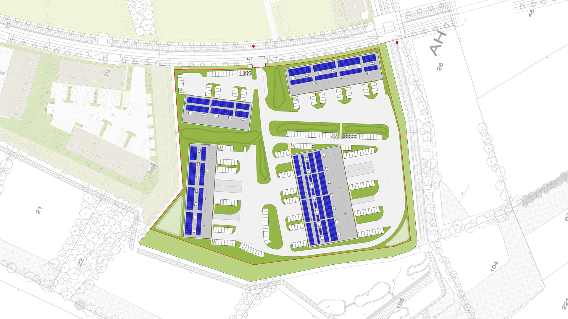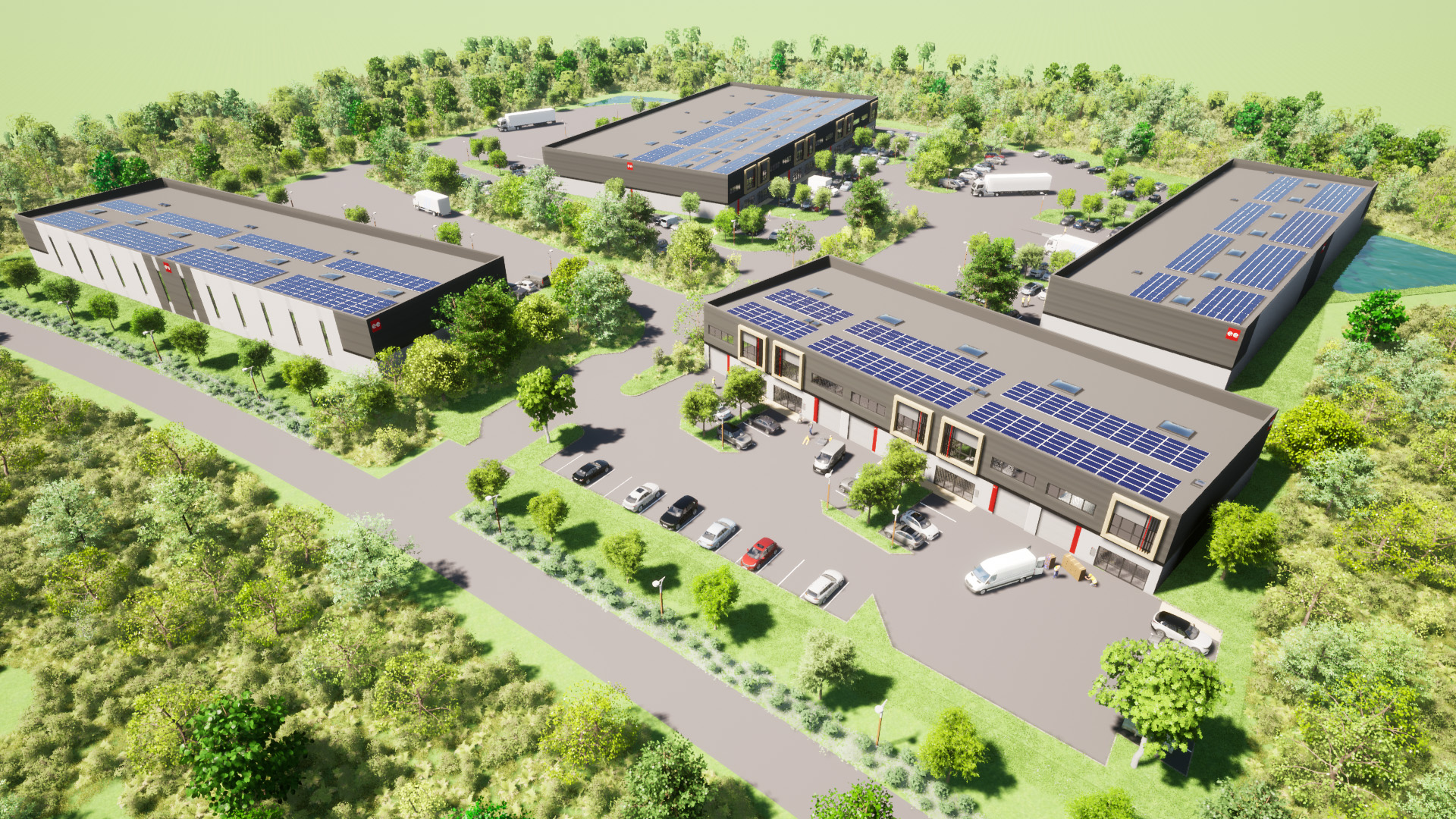 Ce projet de quatre bâtiments d’activités et de bureaux se situe dans la ZAC du bois de la noue. L’organisation de la parcelle est définie par les haies bocagères remarquables existantes qui découpent la parcelle. Le programme prévoit de créer des bâtiments modulables. L’architecture proposée est simple et permet une lecture épurée de l’ensemble bâti. Conjugué à l’organisation du site, le projet créé un cadre de qualité, favorable au développement de l’activité.