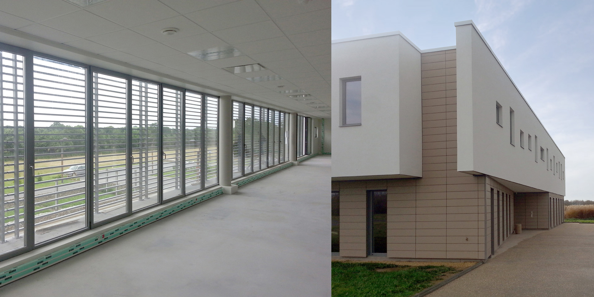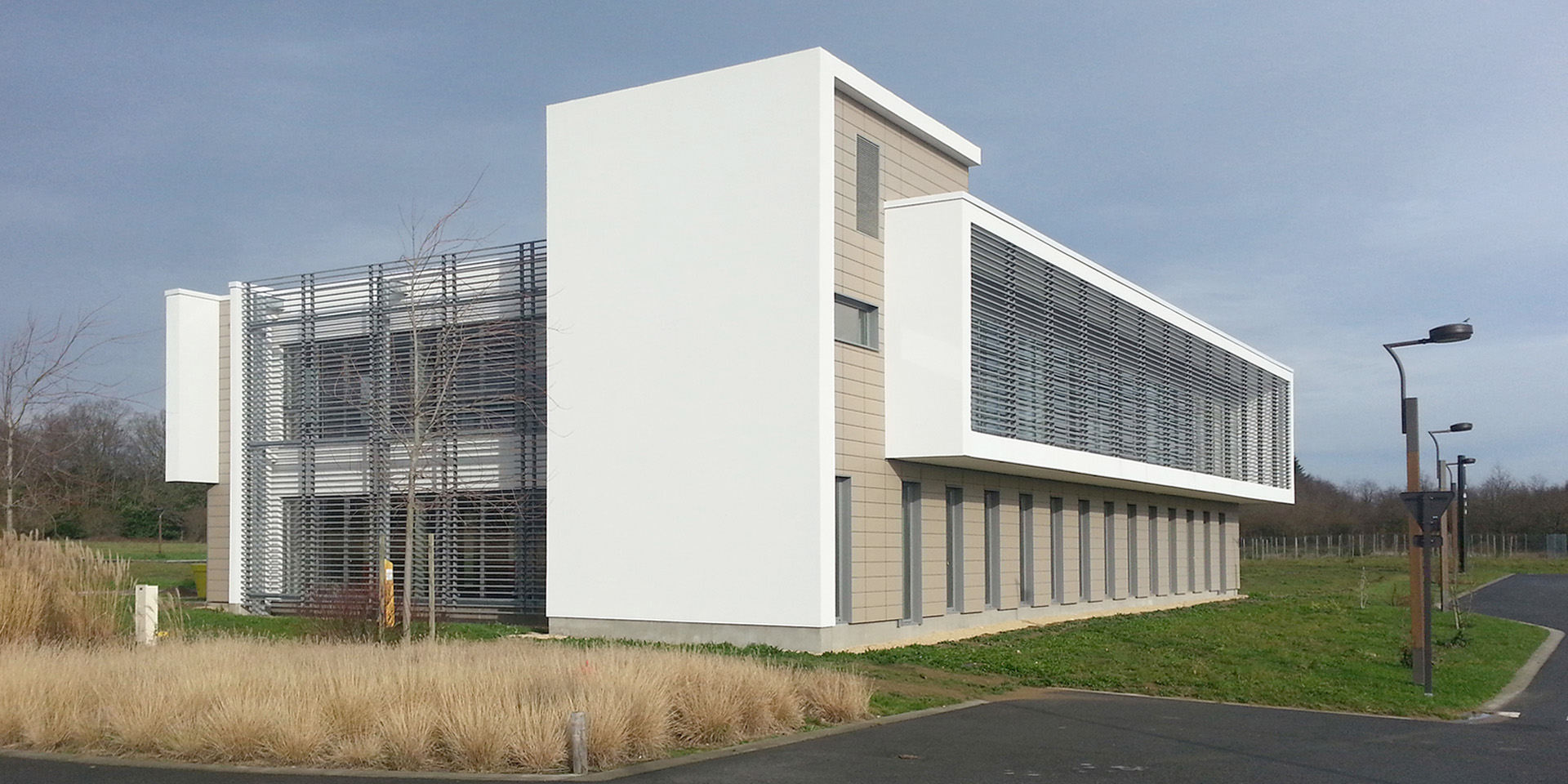 Ce projet de bureau consiste en l’imbrication de trois volumes : deux blocs horizontaux tenus par un élément vertical. Les volumes se fusionnent et se lient avec un jeu de matériaux qui se retournent sur les différentes façades. L’architecture se veut épurée par ses volumes et composée par ses façades. Le projet permet de créer un front bâti et ainsi de marquer l’entrée de la route d’accès au parc du Bois de la Noue.
