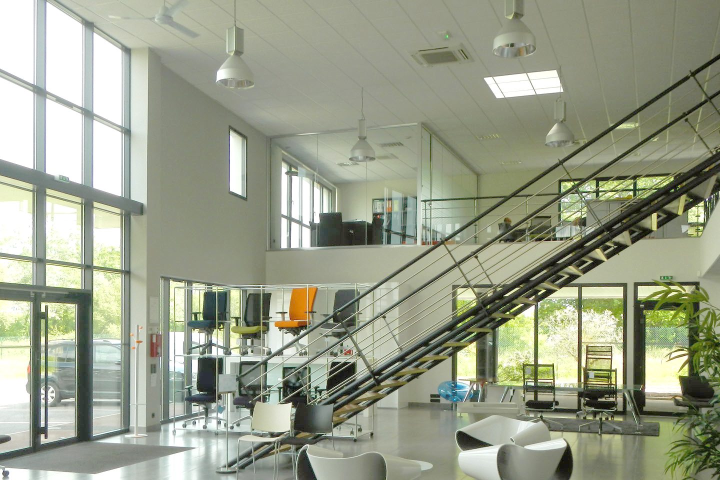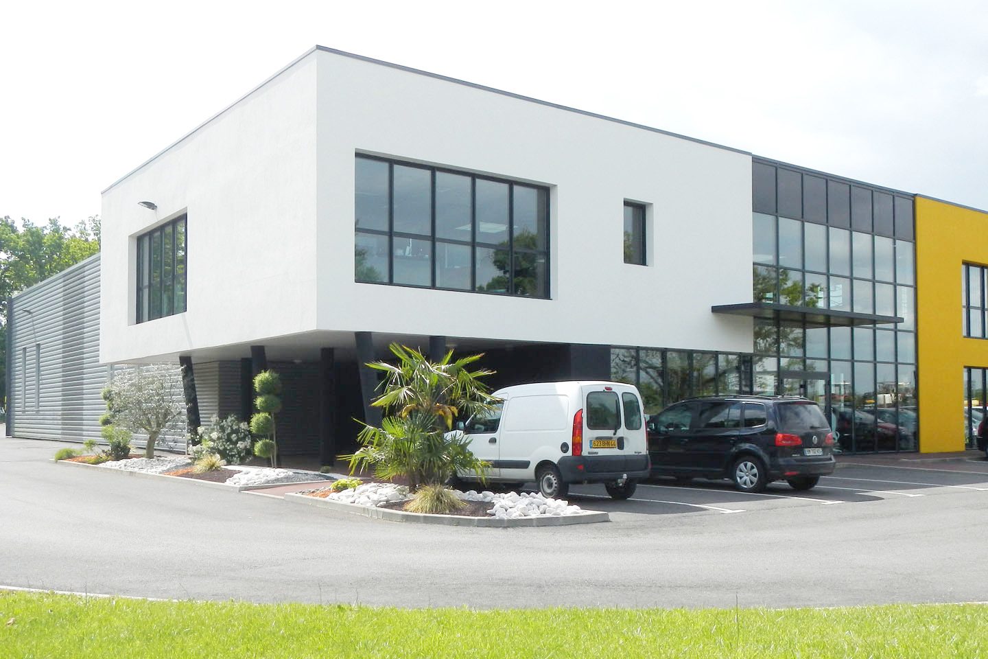 Le programme consiste en la réalisation d’un bâtiment de bureaux et d’entrepôt pour la négoce de matériel de bureaux. Le bâtiment se compose de deux volumes distincts pour chacune des activités. Afin de créer une signalétique forte grâce à une façade architecturée le long de la Départementale, l’espace bureaux est tourné vers le Nord Ouest. En décalage avec l’entrepôt, une partie du volume est en porte-à-faux, signifiant ainsi depuis l’entrée l’emplacement des bureaux, de l’entrée principale et des parkings.