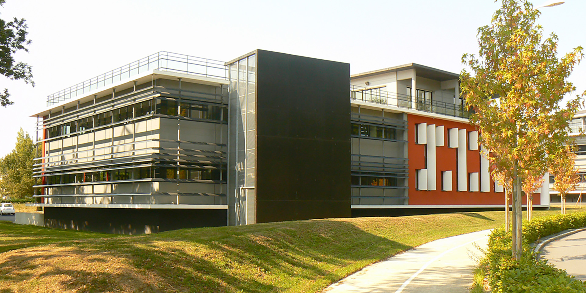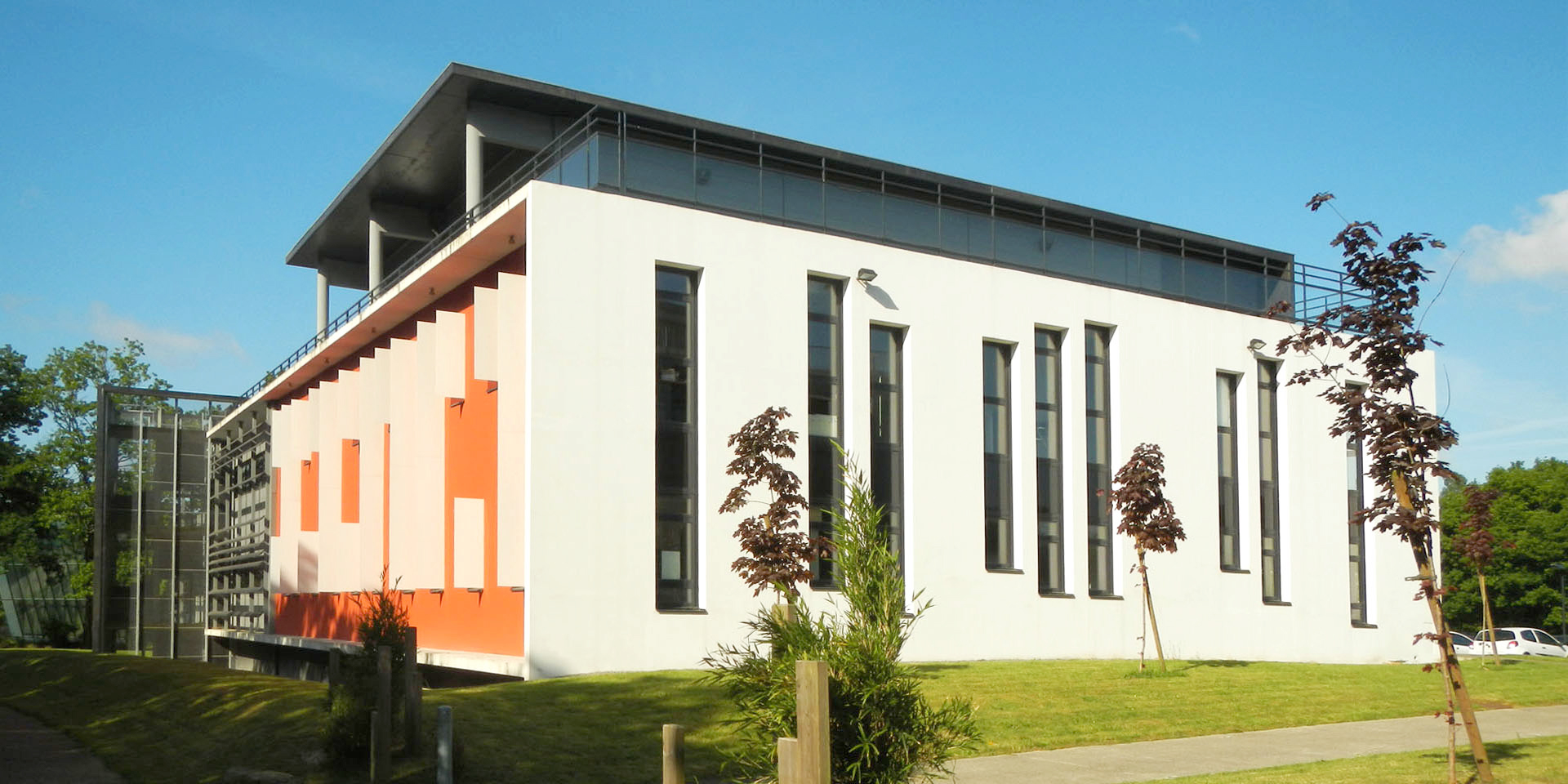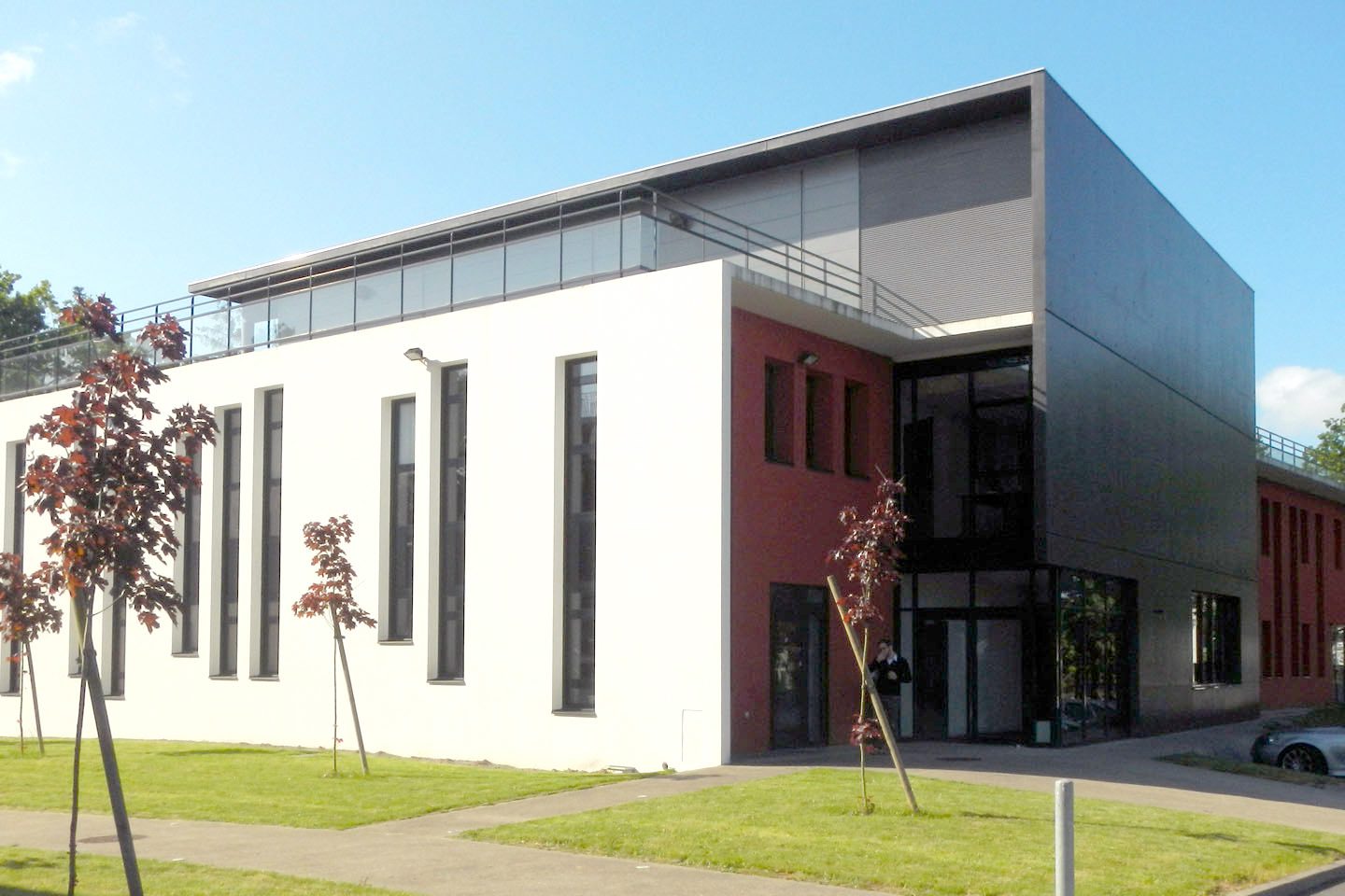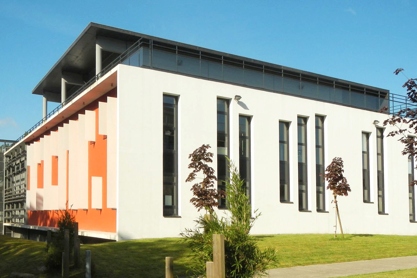 Ce projet de deux bâtiments de bureaux est un proche voisin du Zénith de Nantes. L’agence a choisi d’exploiter les rapports de force pour lier la construction et son environnement naturel. Malgré sa masse apparente, le bâtiment surplombe le sol sur lequel il semble être venu se poser. Imbriqués verticalement, les volumes annexes accentuent l’ancrage de l’ouvrage, tandis que les courbes vertes des pelouses contrastent avec la ligne blanche des façades.