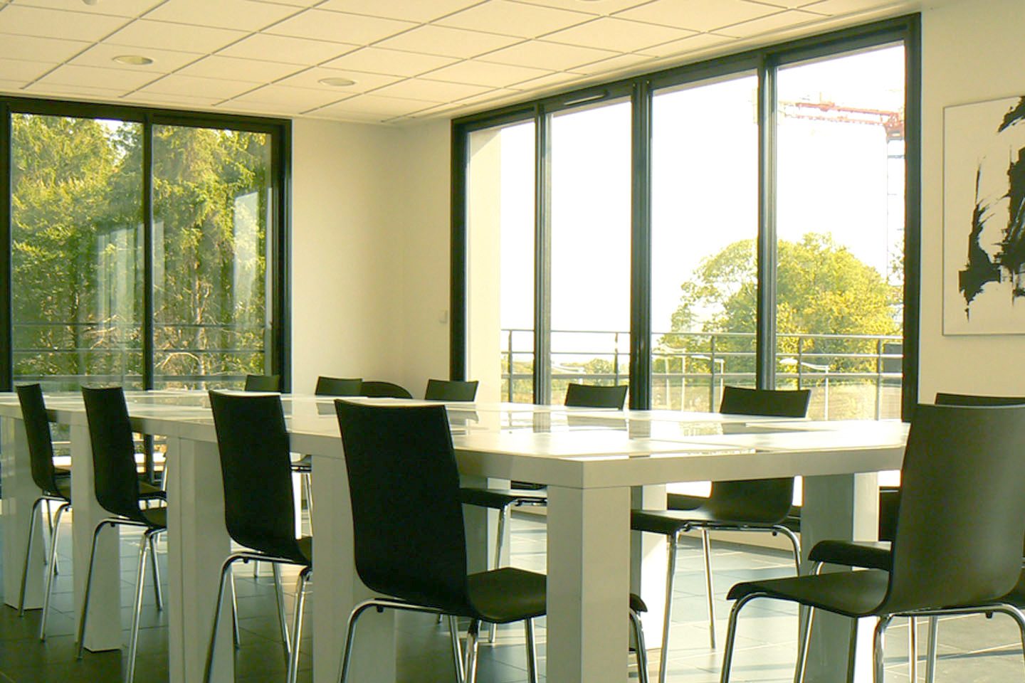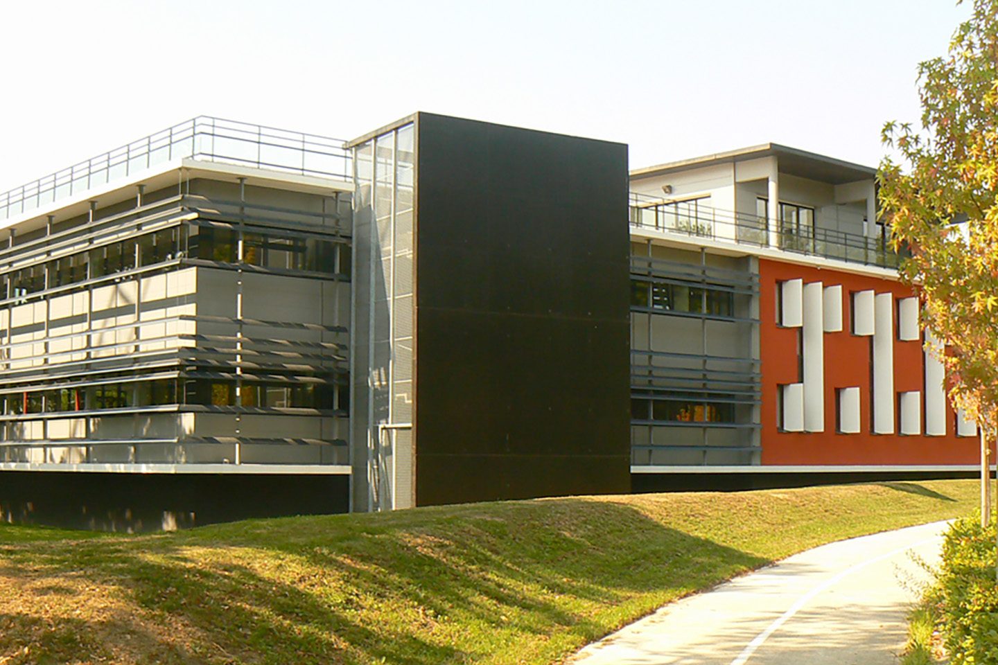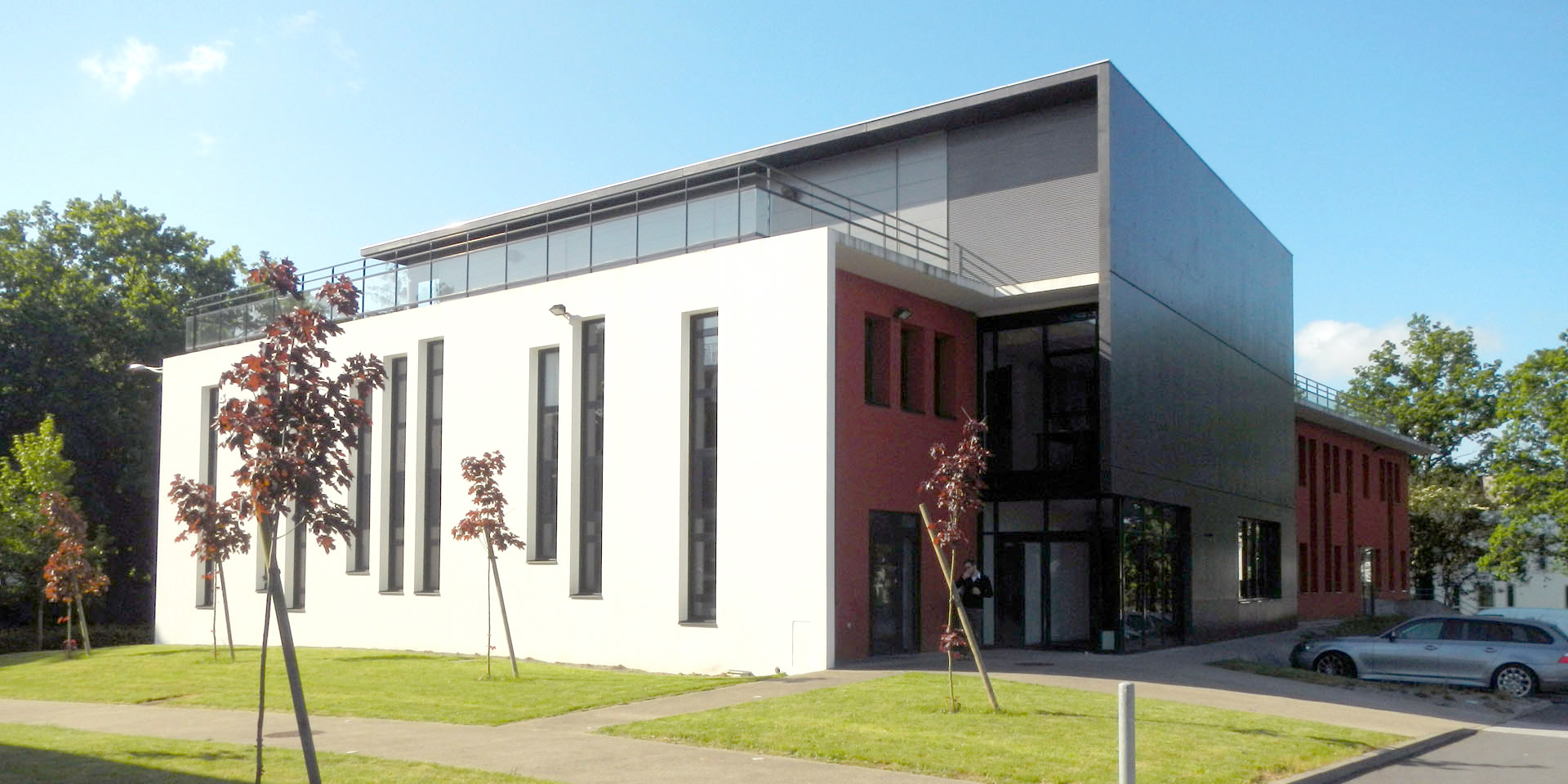 Ce projet de deux bâtiments de bureaux est un proche voisin du Zénith de Nantes. L’agence a choisi d’exploiter les rapports de force pour lier la construction et son environnement naturel. Malgré sa masse apparente, le bâtiment surplombe le sol sur lequel il semble être venu se poser. Imbriqués verticalement, les volumes annexes accentuent l’ancrage de l’ouvrage, tandis que les courbes vertes des pelouses contrastent avec la ligne blanche des façades.