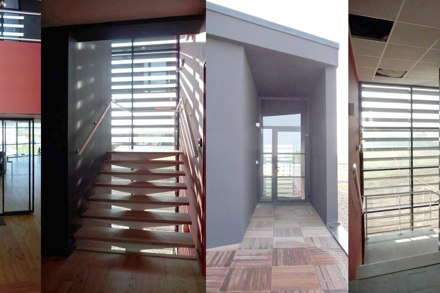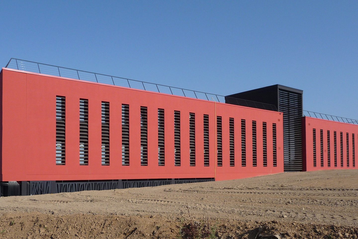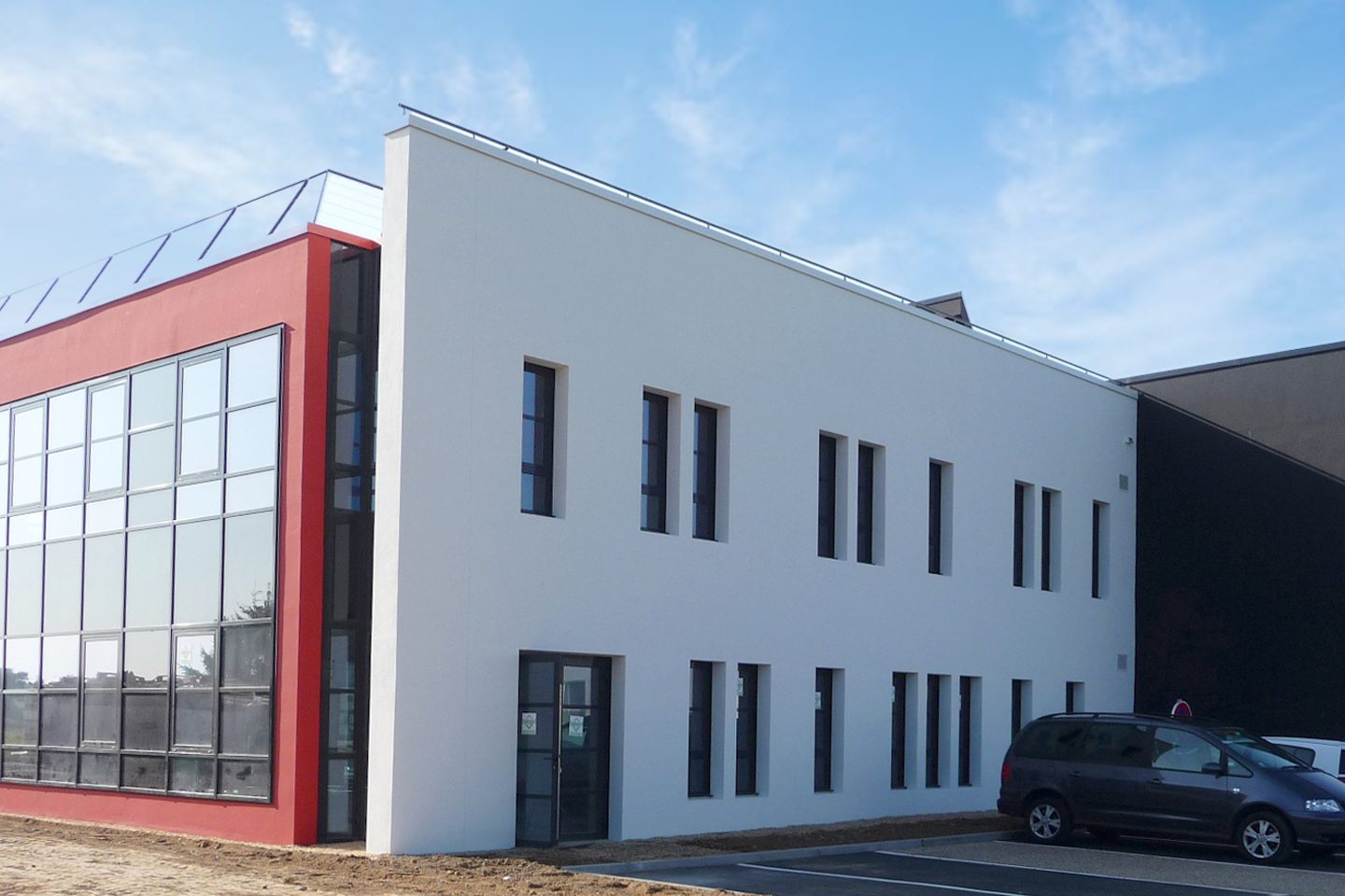 Inscrit dans la perspective de l’avenue principale du Parc d’activités de l’Ecuyère à Cholet, ce bâtiment tout en longueur joue sur les plans et les volumes. Verticales et horizontales se croisent et se complètent. Face au parking bordé par un alignement d’arbres, le long mur blanc de la façade est l’élément central qui segmente l’espace. Ponctué de baies aléatoires et scindé en deux par le contraste de l’entrée en saillie, il semble porter le vaste volume orange suspendu à l’arrière. Ce projet bénéficie d’aménagements environnementaux poussés : orientation optimale du bâtiment, panneaux photovoltaïques, et toiture végétale.