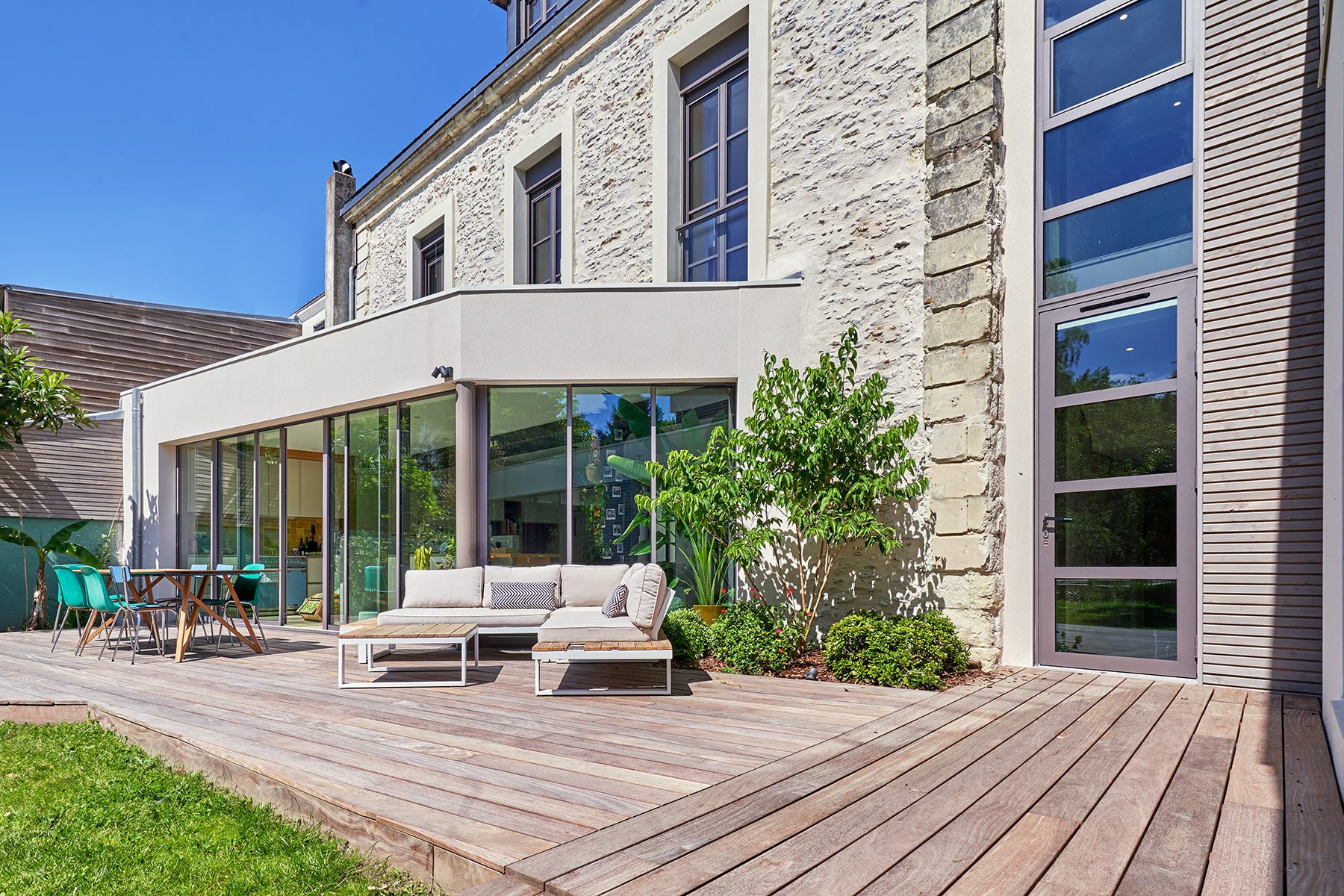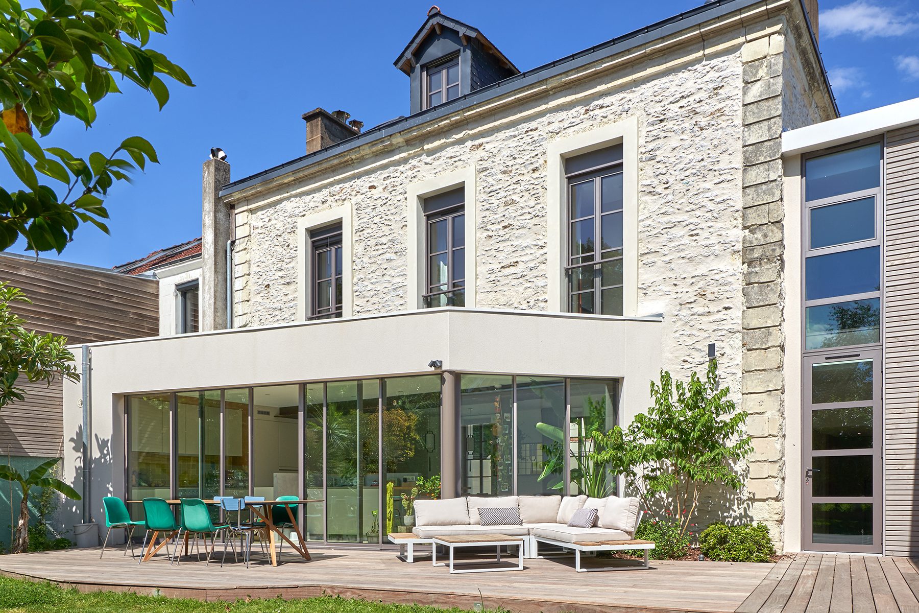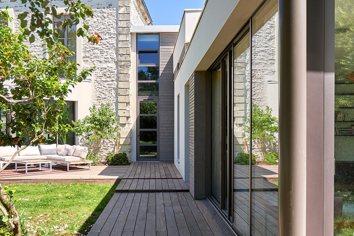La maison existante se dévoile suite à la demolition de l’ensemble des extensions disgracieuses ajoutées au fil des années. Un retour à la pierre est entreprit, les appareillages en tuffeau sont remis à neuf et les ouvertures d’origine sont recréées côté rue.