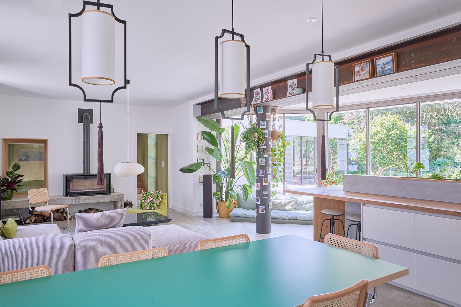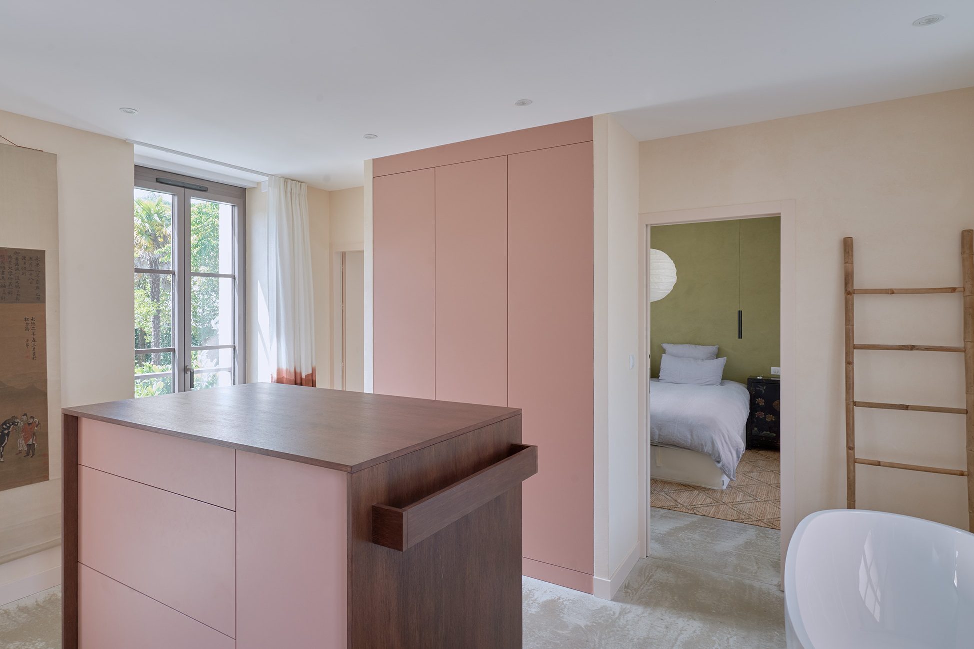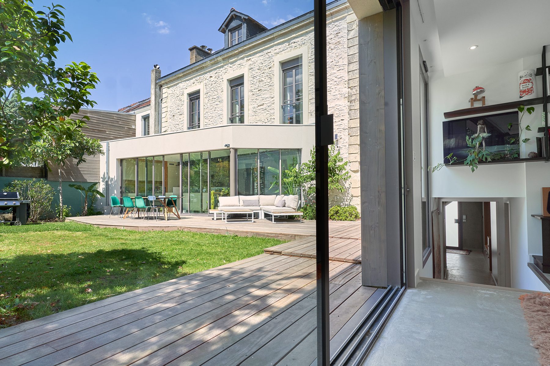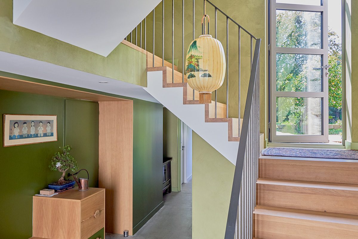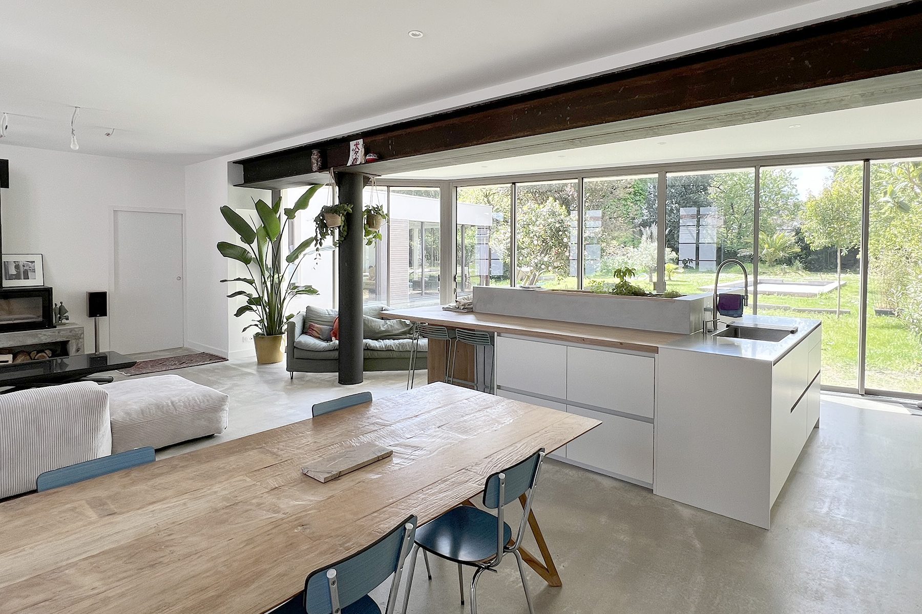 L’entrée est accessible depuis la rue. Elle s’ouvre sur un espace tout en verticalité souligné par un escalier élégant qui dessert les différents niveaux de la maison. En rez-de-Jardin dans la maison existante se situe un grand séjour traversant avec sa cuisine ouverte. L’espace est baigné de lumière grâce à ses grandes baies et son exposition Sud-Ouest. L’espace est ouvert sur le Jardin et son espace boisé classé. Au même niveau, dans l’extension se trouve un deuxième salon plus confidentiel. Les chambres et salles d’eau sont réalisés au premier étage et dans les combles pour completer le programme. La suite parentale occupe l’ensemble du premier étage du bâtiment principal et bénéficie d’une exposition traversante.