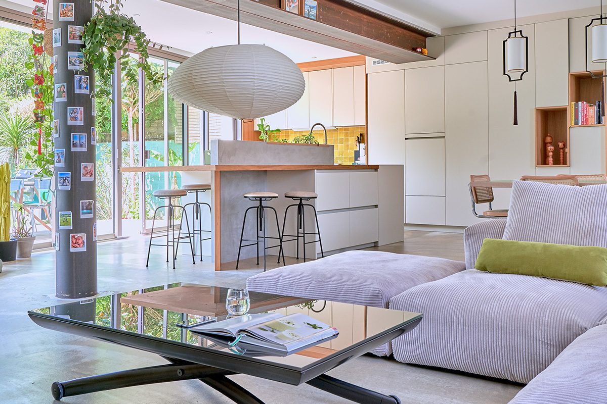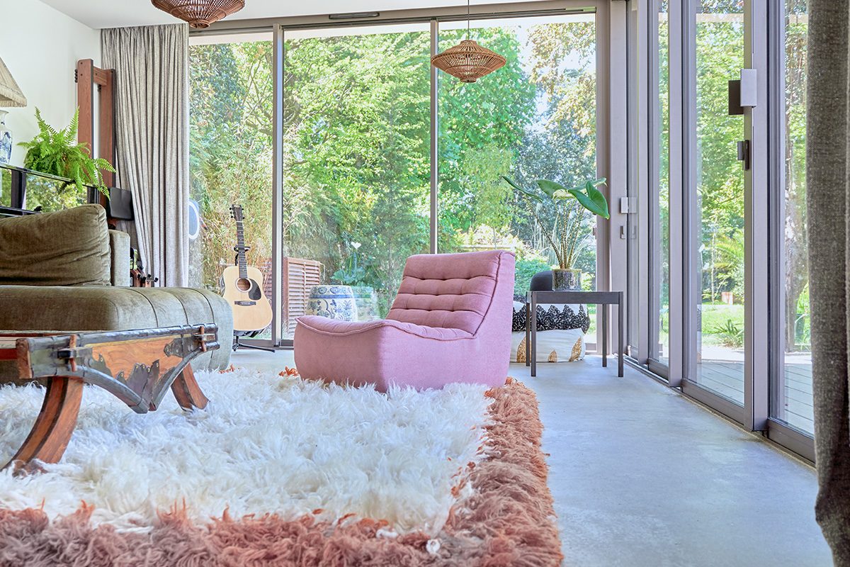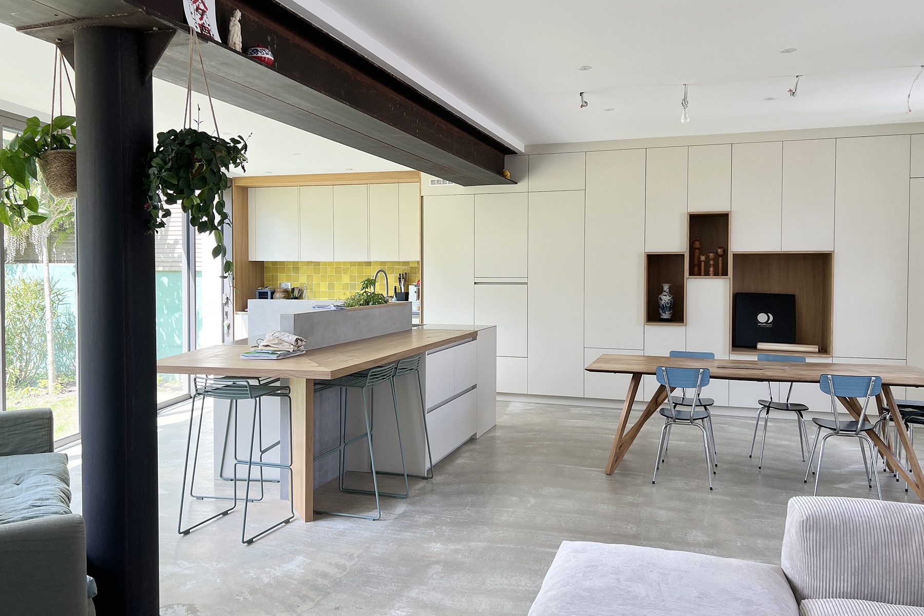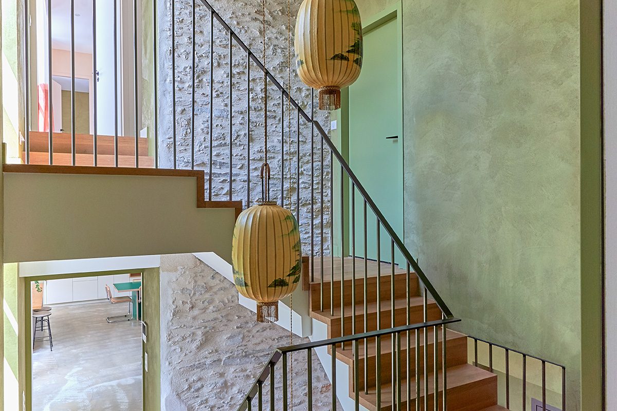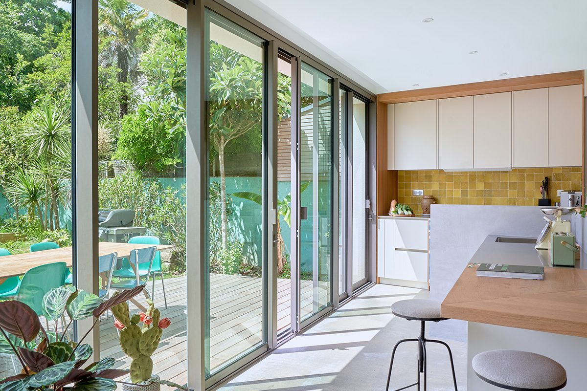 L’entrée est accessible depuis la rue. Elle s’ouvre sur un espace tout en verticalité souligné par un escalier élégant qui dessert les différents niveaux de la maison. En rez-de-Jardin dans la maison existante se situe un grand séjour traversant avec sa cuisine ouverte. L’espace est baigné de lumière grâce à ses grandes baies et son exposition Sud-Ouest. L’espace est ouvert sur le Jardin et son espace boisé classé. Au même niveau, dans l’extension se trouve un deuxième salon plus confidentiel. Les chambres et salles d’eau sont réalisés au premier étage et dans les combles pour completer le programme. La suite parentale occupe l’ensemble du premier étage du bâtiment principal et bénéficie d’une exposition traversante.