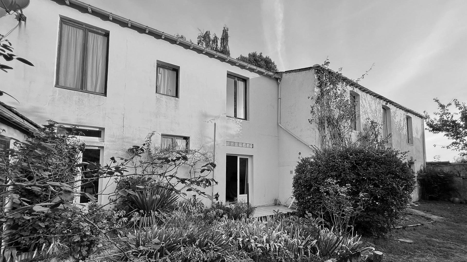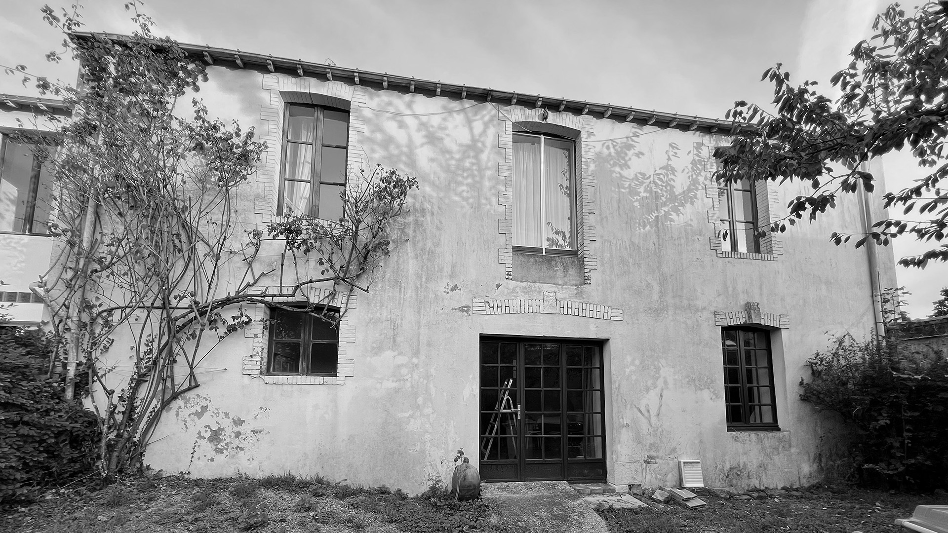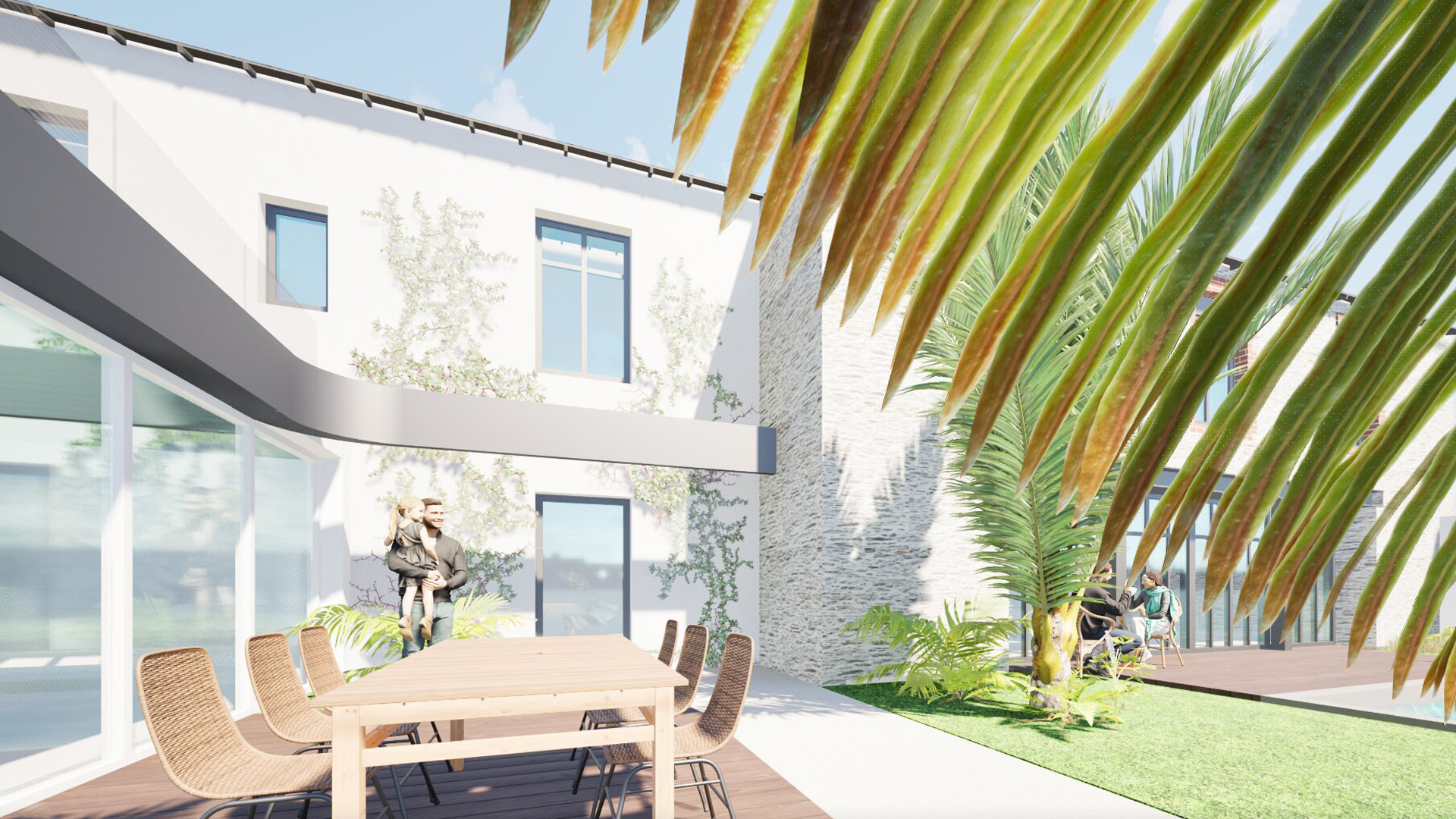 Le projet prévoit l’extension et la rénovation de deux maisons organisées autour d’une cour intérieure. L’une des deux maisons est implantée sur rue, la deuxième en fond de parcelle. Les deux maisons sont reliées par un petit volume monopente. L’objectif de ce projet est de pouvoir créer un ensemble harmonieux d’habitation familial pour une seule habitation et de trouver une unité dans la complémentarité des usages entre les espaces intérieurs et extérieurs, entre les espaces de vie collectifs et intimes à travers une architecture moderne qui repense l’existant sans le faire disparaitre mais qui le met en valeur. Il semble judicieux de développer le thème de l’intériorité avec cet ensemble fermé sur lui-même autour de l’idée du patio, de jouer sur le rapport dedans dehors au sein de cet ensemble avec des grandes baies vitrées permettant de voir sur toute la profondeur de la parcelle et ainsi utiliser le sol extérieur et intérieur comme un élément structurant au même titre que tous les éléments architecturaux et paysagés du site : soit le bâti et le vide, l’opacité et la transparence, le minéral, le végétal, l’eau, le ciel et le soleil. Afin de garantir l’unité fonctionnelle des bâtiments existants, le petit volume entre les deux maisons principales est déposé pour laisser place à un volume de liaison moderne, très vitré, et épuré. Ce dernier enrichi l’ensemble architectural du site avec un jeu de lignes verticales et horizontales entre le rez-de-chaussée et le volume émergeant à l’étage. Le bandeau se retourne sur la façade existante du bâtiment en fond de parcelle et permet de formaliser l’entrée principale de la maison avec l’intégration d’un auvent vitré.