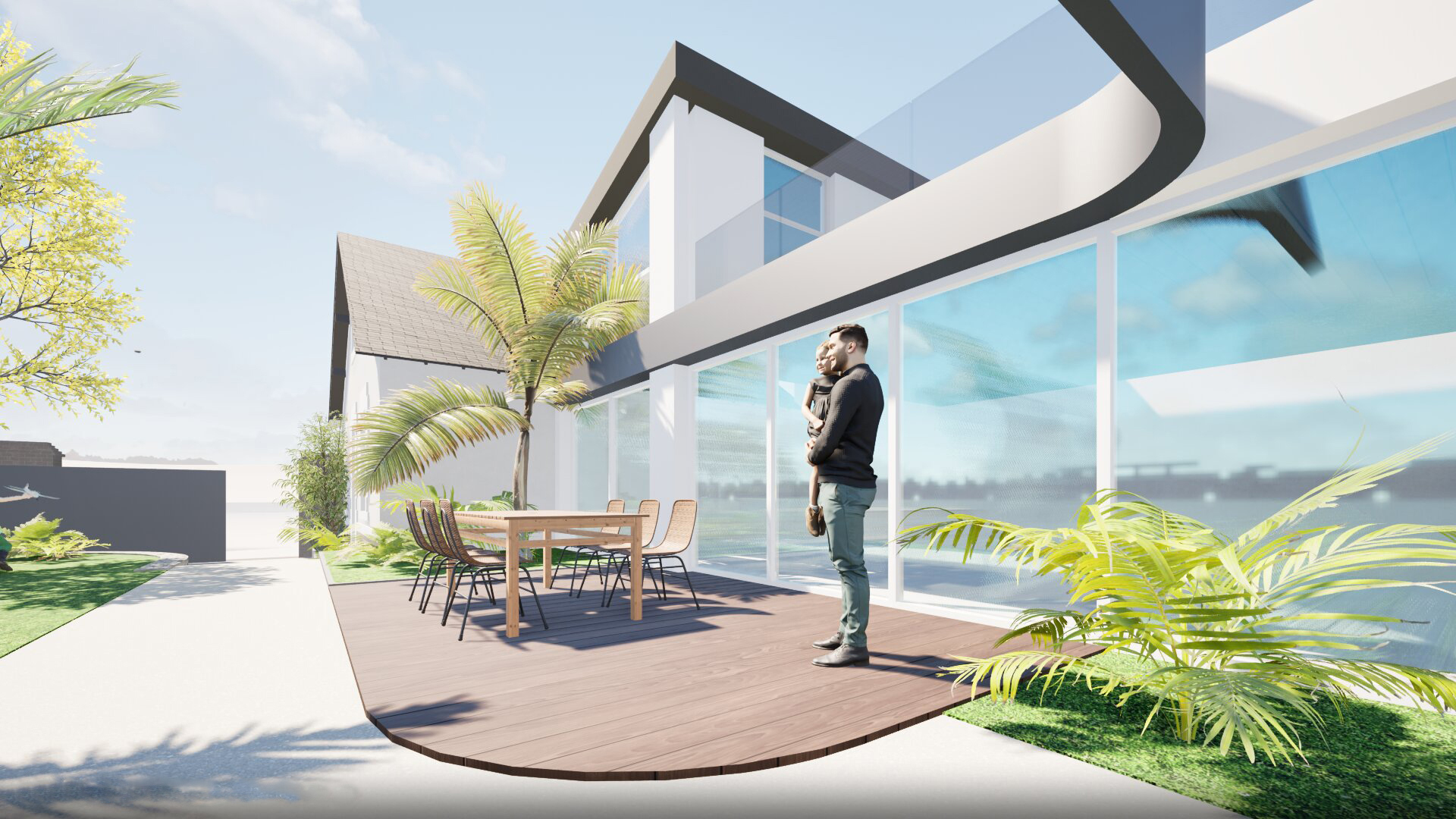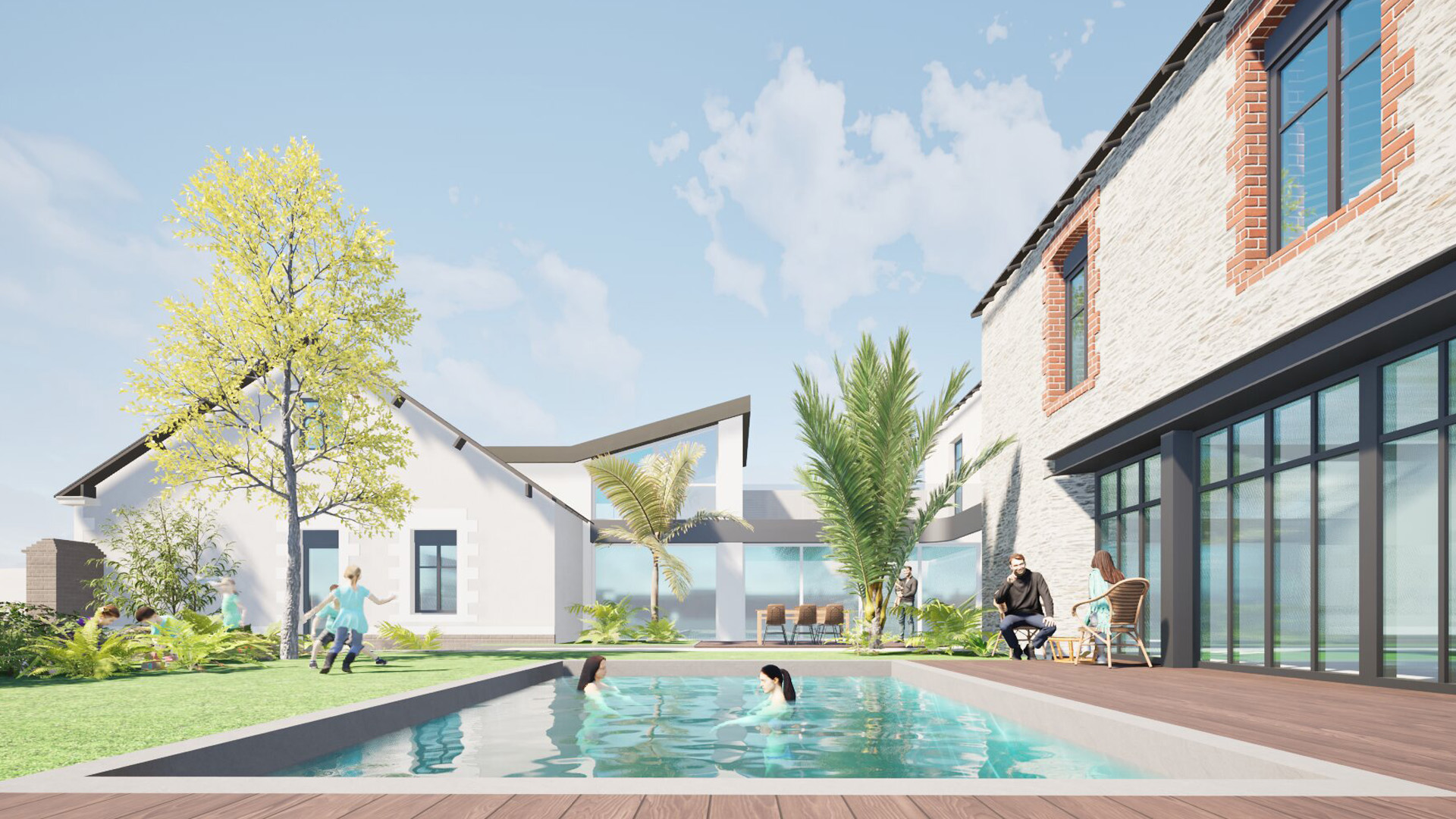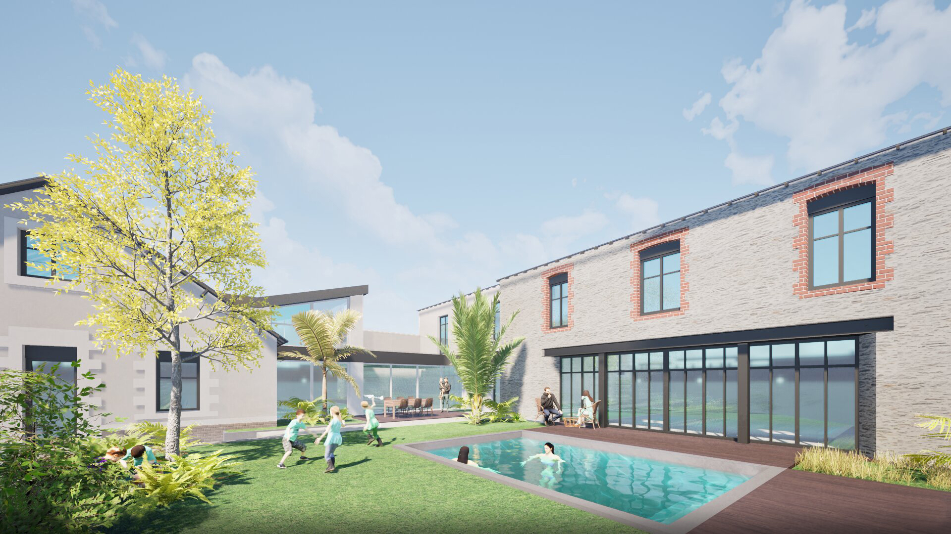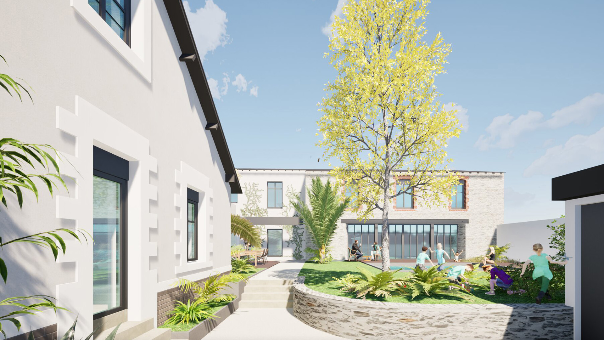 Le projet prévoit l’extension et la rénovation de deux maisons organisées autour d’une cour intérieure. L’une des deux maisons est implantée sur rue, la deuxième en fond de parcelle. Les deux maisons sont reliées par un petit volume monopente. L’objectif de ce projet est de pouvoir créer un ensemble harmonieux d’habitation familial pour une seule habitation et de trouver une unité dans la complémentarité des usages entre les espaces intérieurs et extérieurs, entre les espaces de vie collectifs et intimes à travers une architecture moderne qui repense l’existant sans le faire disparaitre mais qui le met en valeur. Il semble judicieux de développer le thème de l’intériorité avec cet ensemble fermé sur lui-même autour de l’idée du patio, de jouer sur le rapport dedans dehors au sein de cet ensemble avec des grandes baies vitrées permettant de voir sur toute la profondeur de la parcelle et ainsi utiliser le sol extérieur et intérieur comme un élément structurant au même titre que tous les éléments architecturaux et paysagés du site : soit le bâti et le vide, l’opacité et la transparence, le minéral, le végétal, l’eau, le ciel et le soleil. Afin de garantir l’unité fonctionnelle des bâtiments existants, le petit volume entre les deux maisons principales est déposé pour laisser place à un volume de liaison moderne, très vitré, et épuré. Ce dernier enrichi l’ensemble architectural du site avec un jeu de lignes verticales et horizontales entre le rez-de-chaussée et le volume émergeant à l’étage. Le bandeau se retourne sur la façade existante du bâtiment en fond de parcelle et permet de formaliser l’entrée principale de la maison avec l’intégration d’un auvent vitré.