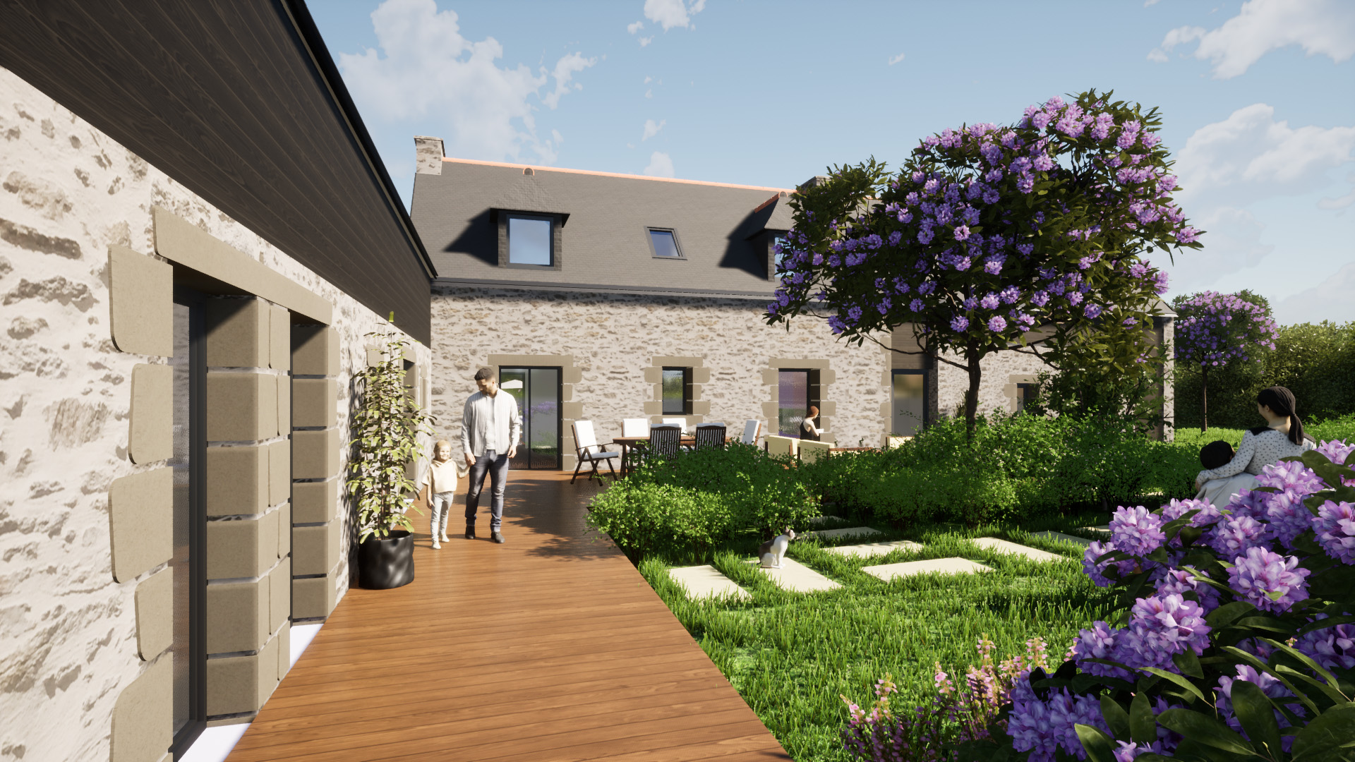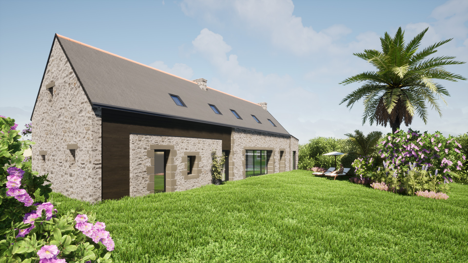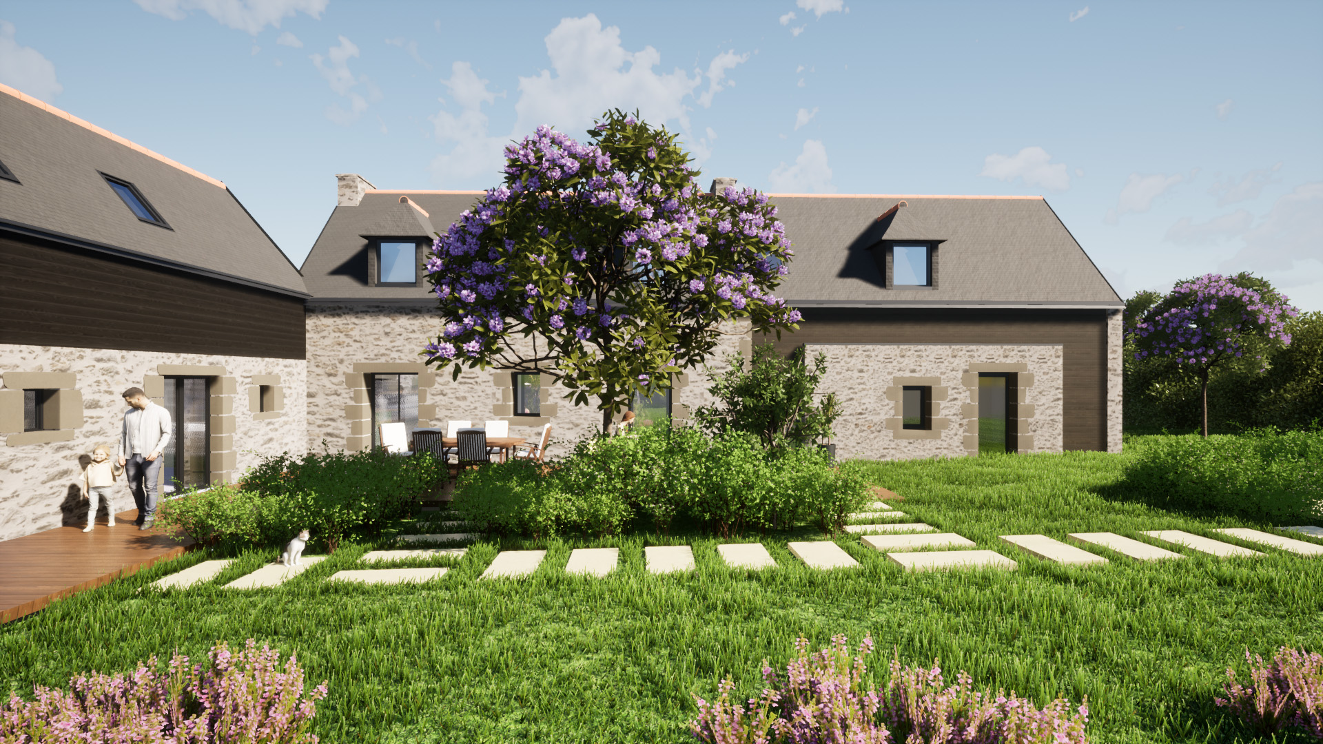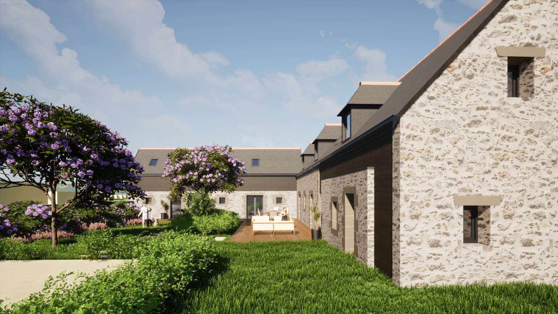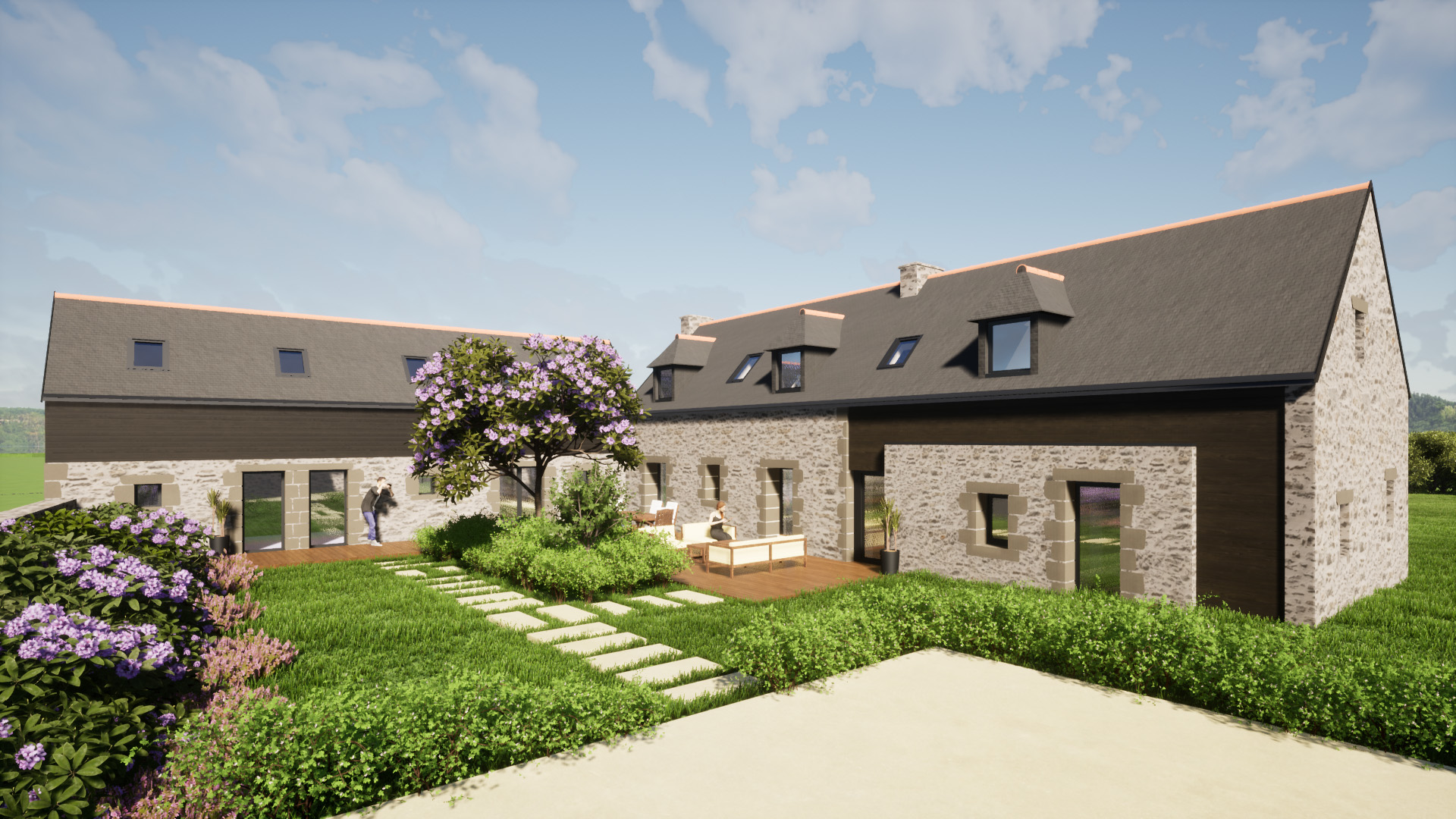Le projet prévoit la mise en valeur et renovation totale de d’une maison traditionnelle en pierre et de la longère attenante. L’ensemble se situe en sortie de hameau et est entouré par les champs. La vue est dégagée sur les cultures et la chapelle Sainte-Marguerite. Deux extensions et une surélévation contemporaines sont réalisées en prolongement des volumes existants proposant un ensemble architectural cohérent.