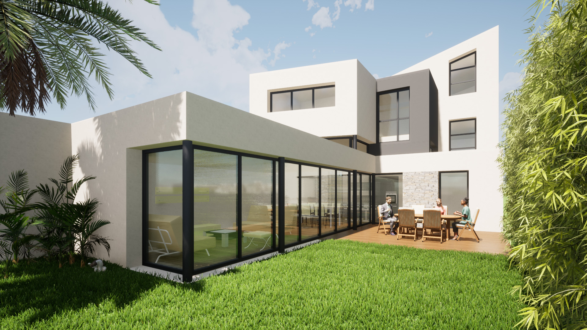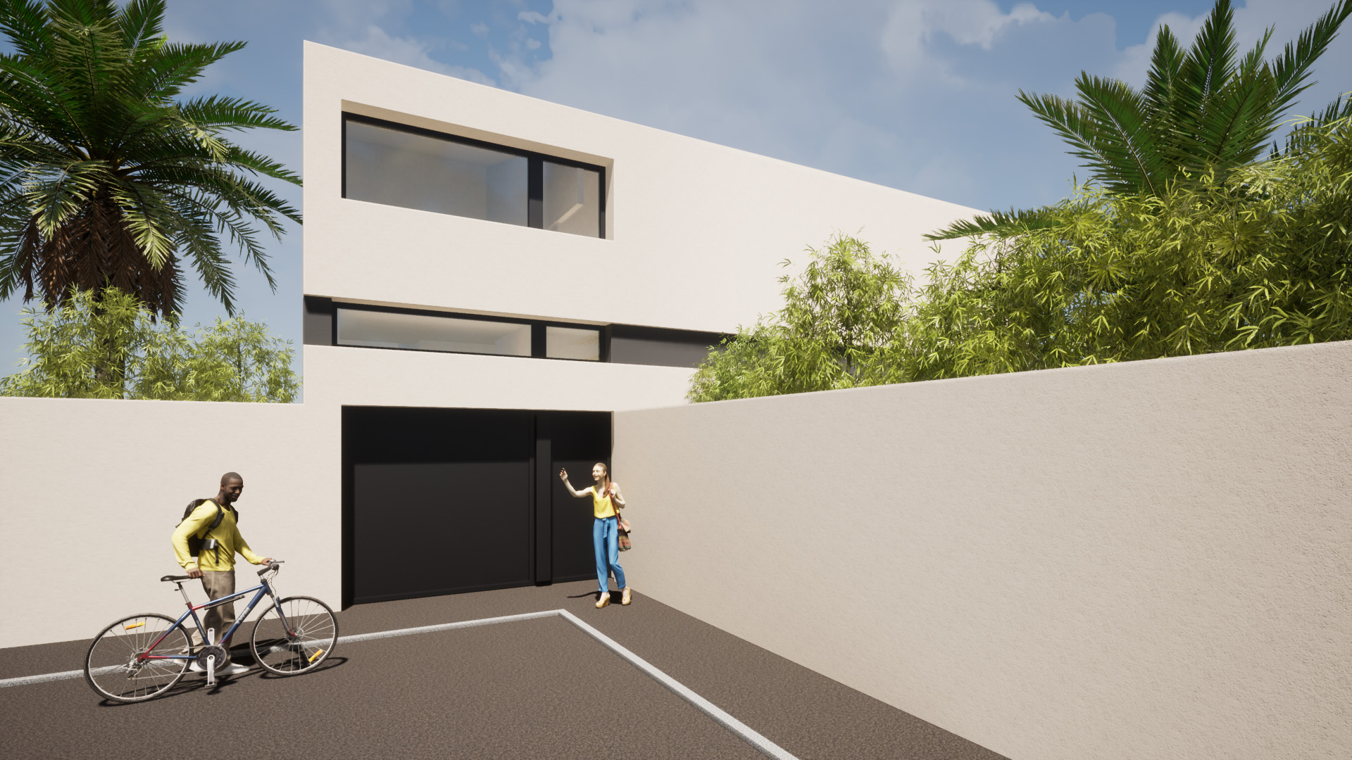 L’étude prévoit la construction d’une maison individuelle sur deux niveaux plus combles. L’architecture se veut résolument moderne et économe. Le projet répond à un programme fonctionnel exigeant permettant de créer par des demis-niveaux une écriture architecturale épurée et composée qui s’experiment à travers le jeu des pleins et des vides et celui des assemblages de volumes. Ce travail volumétrique permet d’exprimer des façades tout en sobriété avec une impression de masse suspendue. Le volume sous combles se développe sous une monopente saillante gardant l’unité volumétrique du projet et son caractère moderne. L’entrée est accessible directement depuis la rue. Cet espace fonctionnel, grâce à ses nombreux rangements offre une perspective sur le vaste séjour complètement ouvert sur le jardin. Un bureau complète le programme au rez-de-chaussée. L’étage et les combles sont occupés par les espaces nuits.