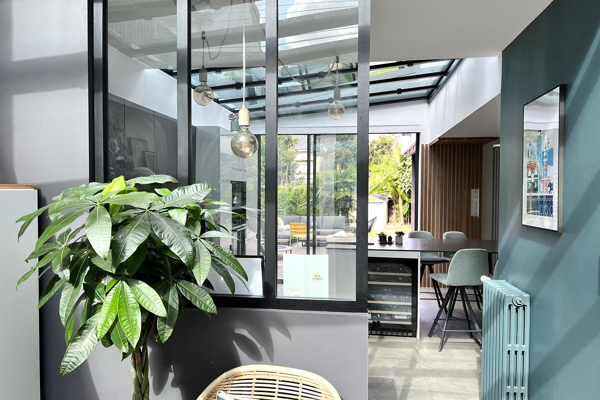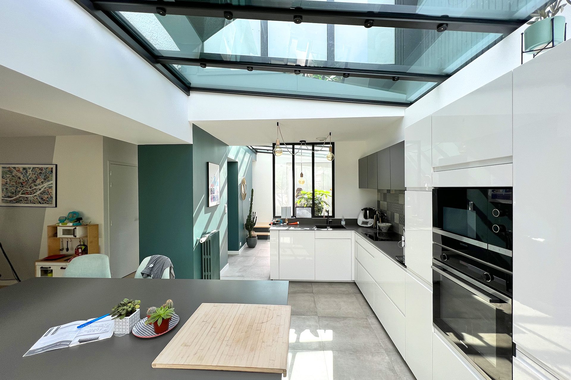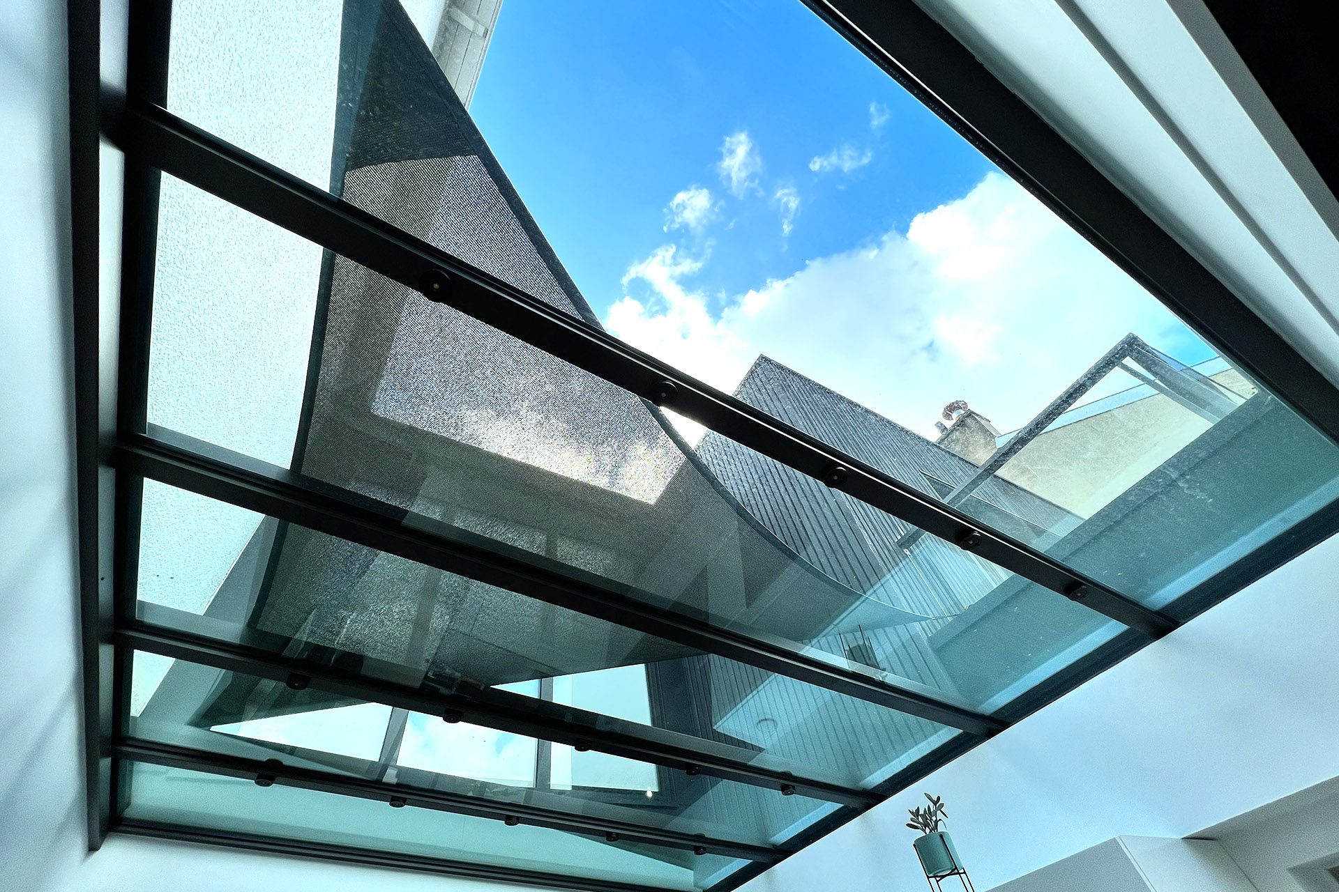 La maison est accessible depuis la rue. L’entrée fonctionnelle est traversante et offre une vue directe sur le jardin. Dans le prolongement, la cuisine est ouverte sur le vaste séjour lumineux. Ces espaces sont organisés en L autour de la terrasse. Une première chambre et sa salle d’eau sont situées au rez-de-chaussée. Le programme est complété à l’étage par deux chambres, une salle de bain et une suite parentale accessible par une passerelle vitrée donnant sur deux verrières éclairant la cuisine et l’entrée.