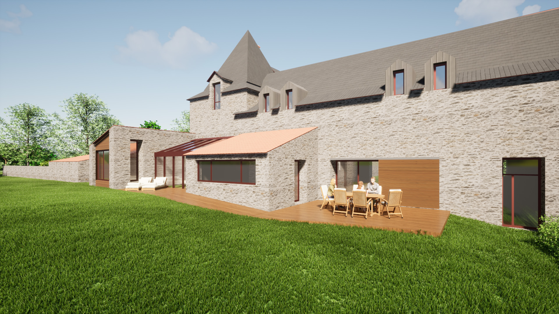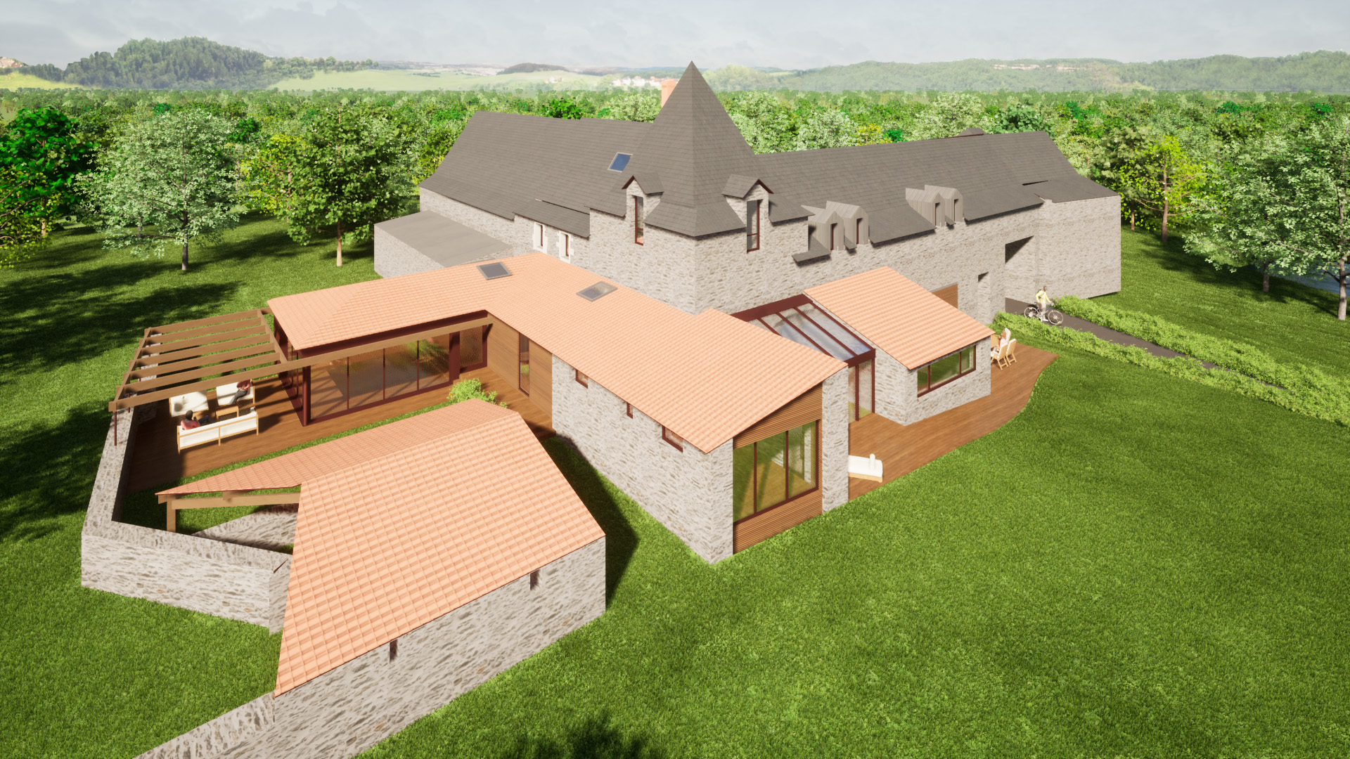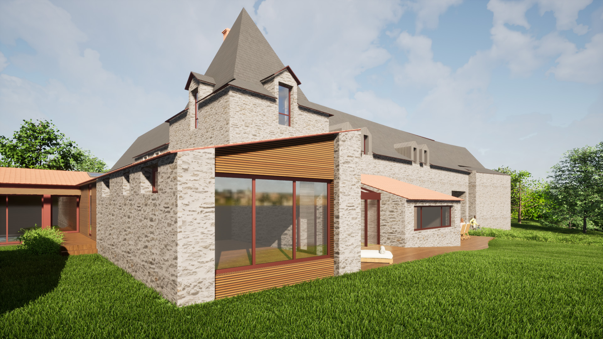 Le projet consiste en la rénovation et l’extension d’un manoir. Un espace bien-être est prévu avec une piscine et une salle de sport.