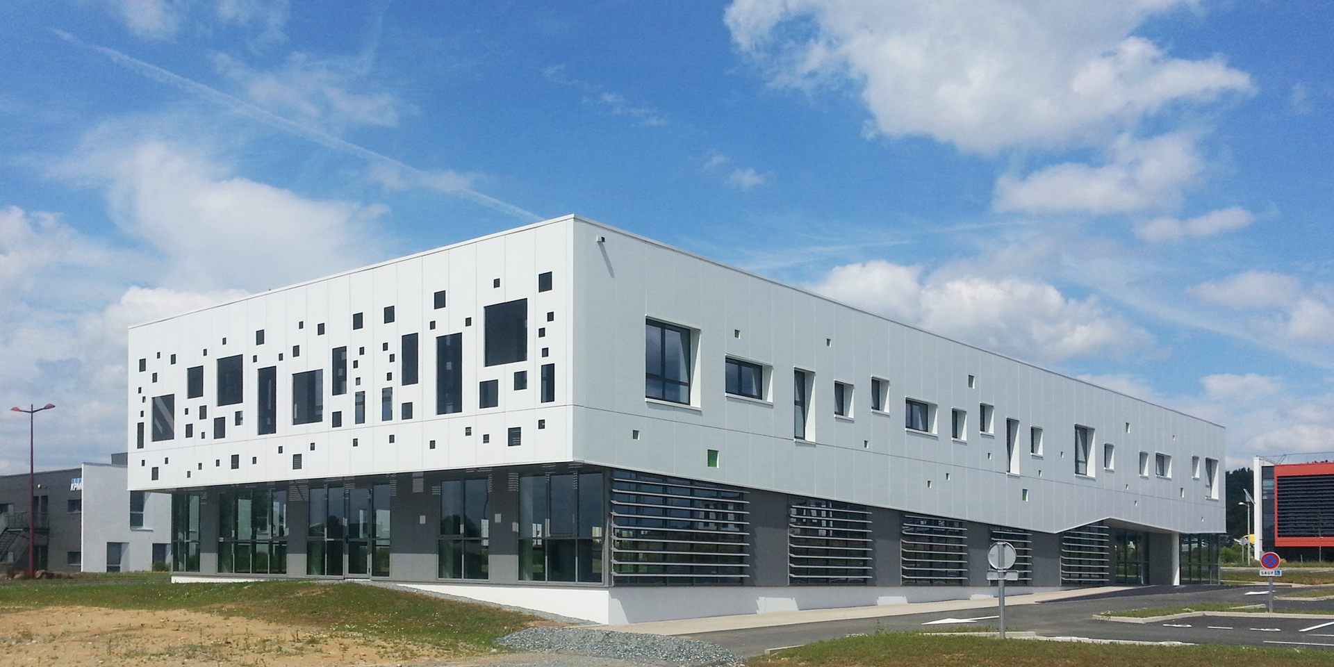 Ce projet de bureaux se situe sur la commune de Cholet dans le parc de l’Ecuyère. Le projet est un triptyque : un socle en béton blanc qui assoit le bâtiment. sur lequel repose le rez-de-chaussée habillé de verre et de métal. Le deuxième niveau vient quant à lui finir le bâtiment. Il est en saillie par rapport au niveau 1. Sa peau métallique est ponctuée de percements organisés selon un rythme bien précis. Sa sous-face oscille au fil des façades. L’architecture se veut épurée par ses volumes et composée par ses façades.