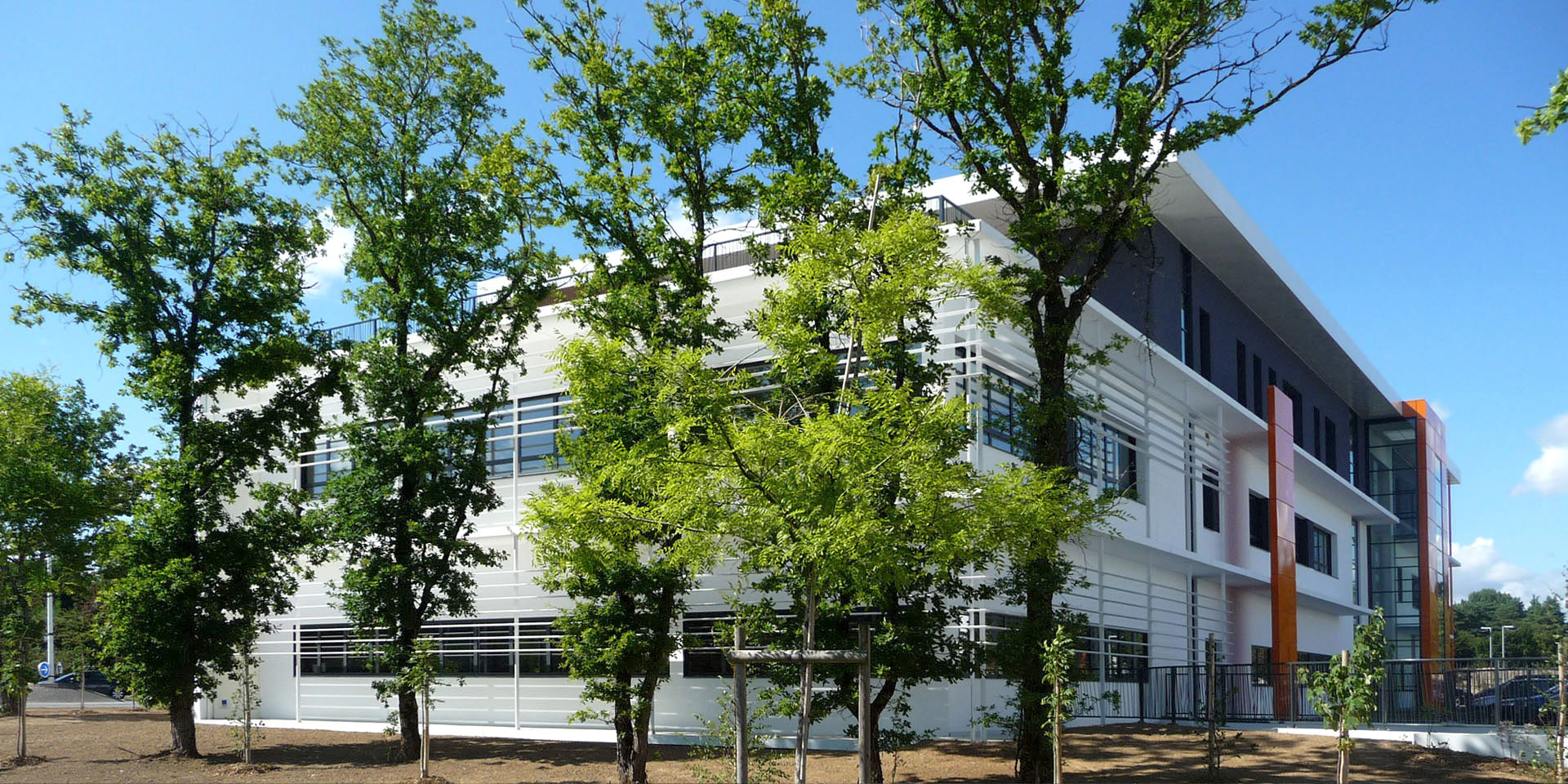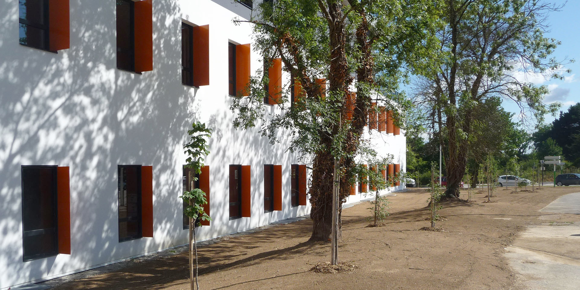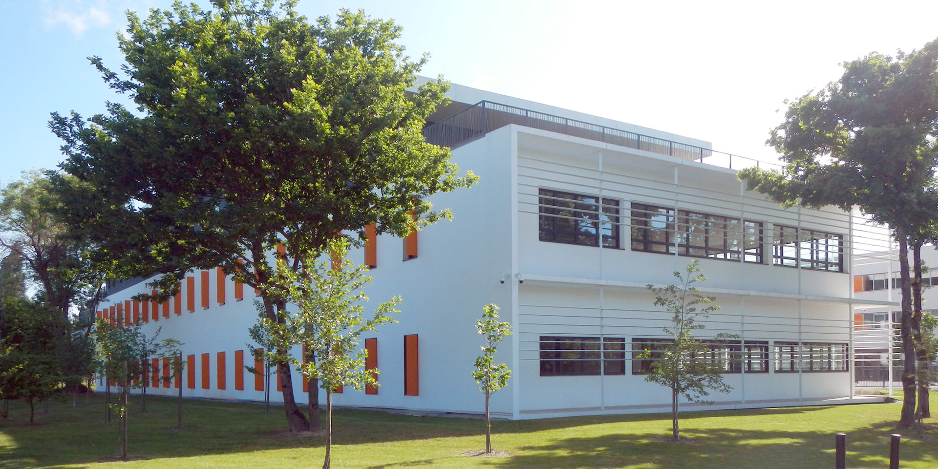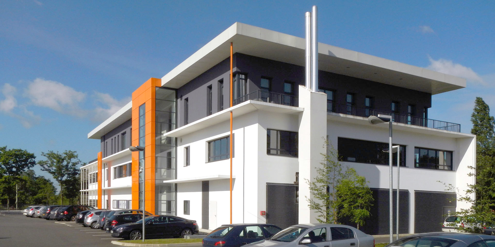 Le programme prévoit la réalisation d’un bâtiment de bureaux et d’hébergement informatique. Le projet est l’expression d’une architecture simple dans ses volumes qui se structure autour d’un rapport entre l’intérieur et l’extérieur de l’îlot. La façade Ouest se développe sur trois niveaux et marque un langage classique où l’ordonnancement des ouvertures rythme son écriture. La façade intérieure, plus complexe, joue avec les casquettes, les ouvertures horizontales et verticales. L’entrée des halls, de couleur orange, rappelle les couleurs de la société et vient contraster avec les couleurs blanc et anthracite qui composent le reste du bâtiment. Le dernier niveau se détache du reste et permet un couronnement du bâtiment, accentué par la présence de casquettes (protection du soleil) qui allègent le volume. Des terrasses accessibles depuis le dernier niveau permettent à cet immeuble de bureaux une utilisation optimum des surfaces de plancher pour les usagers. La toiture terrasse du R+2 sert à l’implantation d’aérotherme pour le fonctionnement de l’activité du site qui hébergera à terme des serveurs informatiques au sous sol et au rez-de-chaussée, tout en y intégrant des toitures végétales. L’aménagement paysagé s’inscrit aussi dans la même logique que celle du bâtiment. Le long du boulevard, une plantation importante d’arbres (érable, bouleaux) vient densifier un mur végétal laissant apparaître le bâtiment qui se découvre véritablement au niveau du giratoire. Le projet répond donc à plusieurs enjeux. Créer un espace de travail qui structure l’entrée du site d’Armor avec un bâtiment signifiant et un aménagement paysagé qui dessine et s’inscrit dans la continuité du Parc Tertiaire d’Ar Mor.