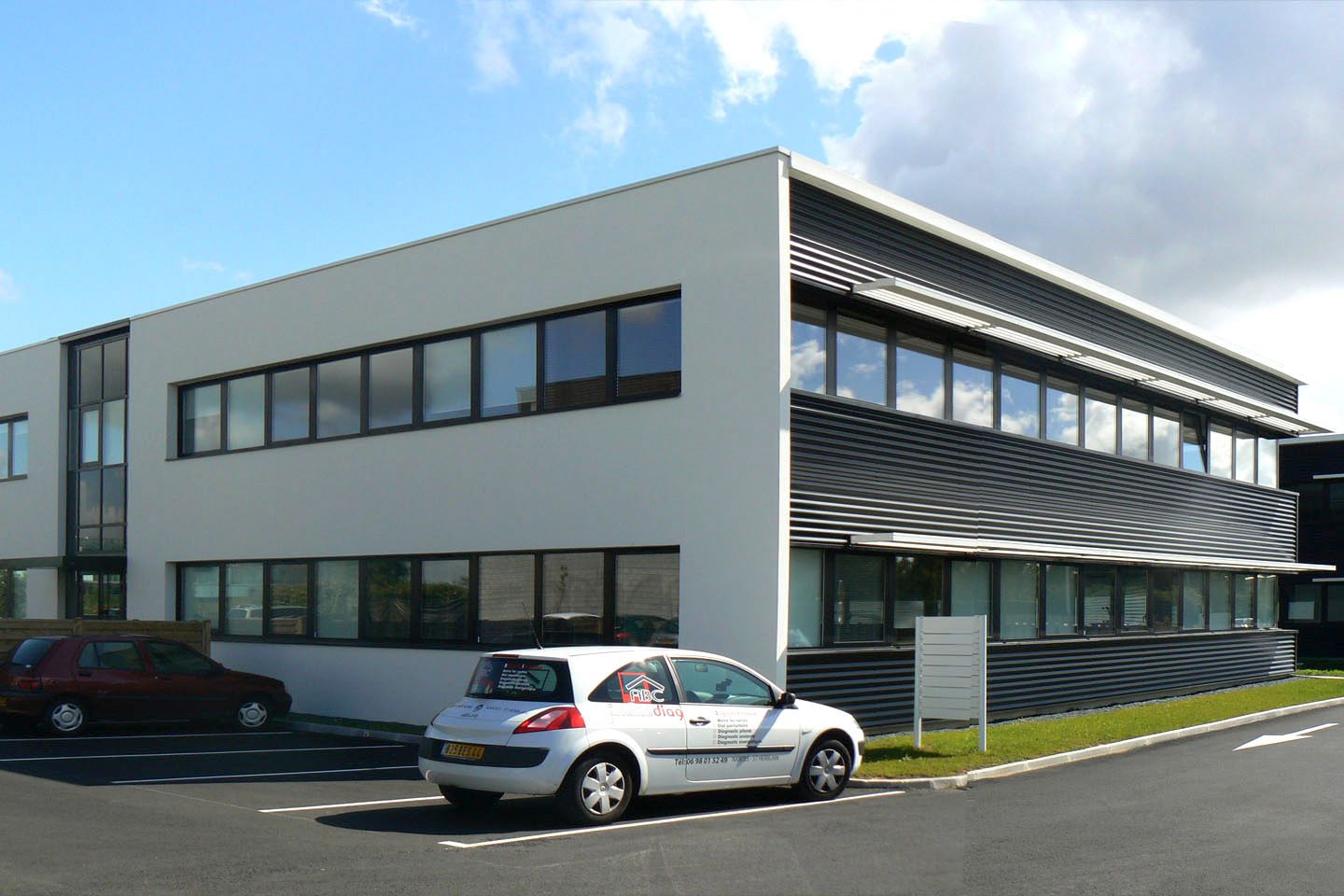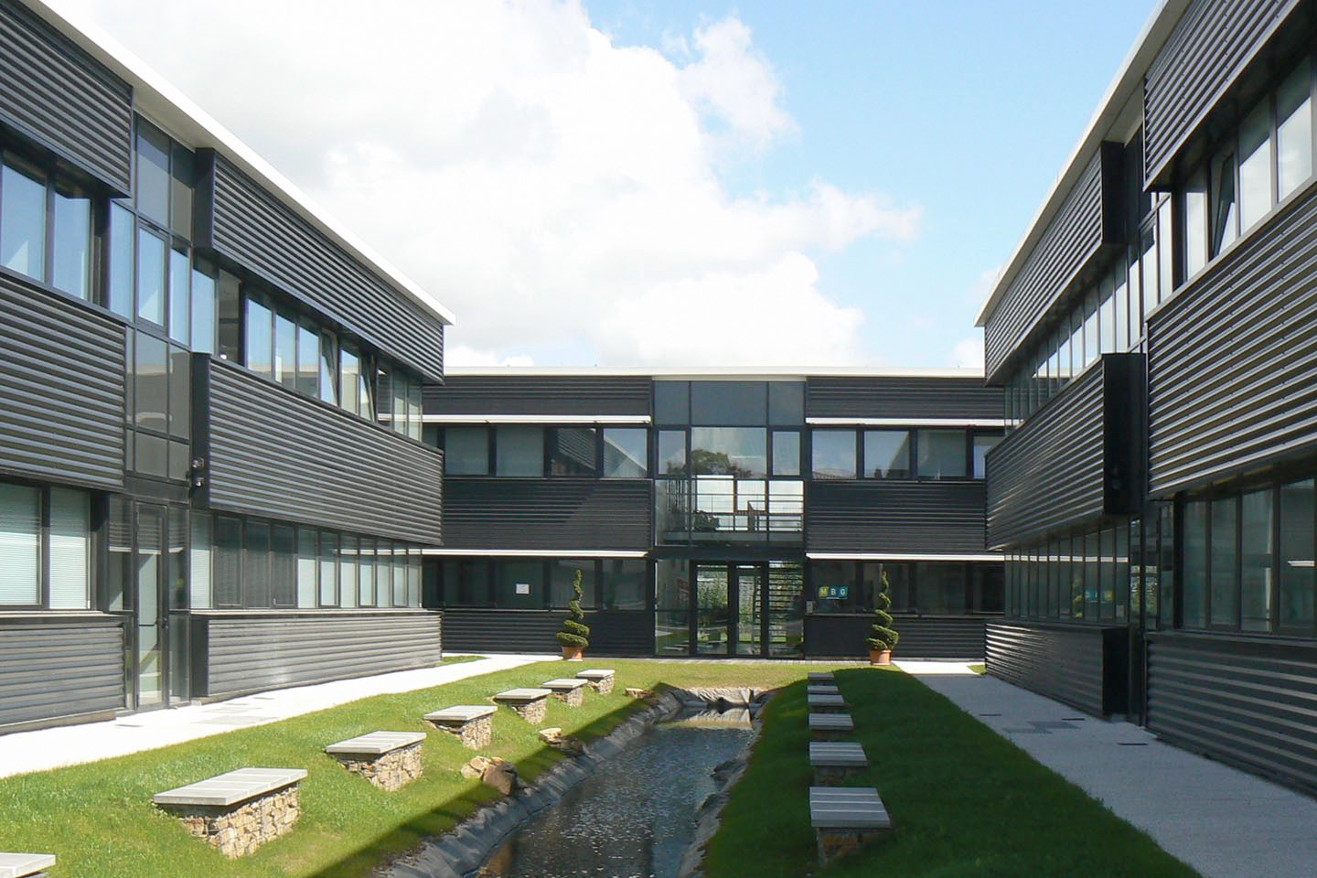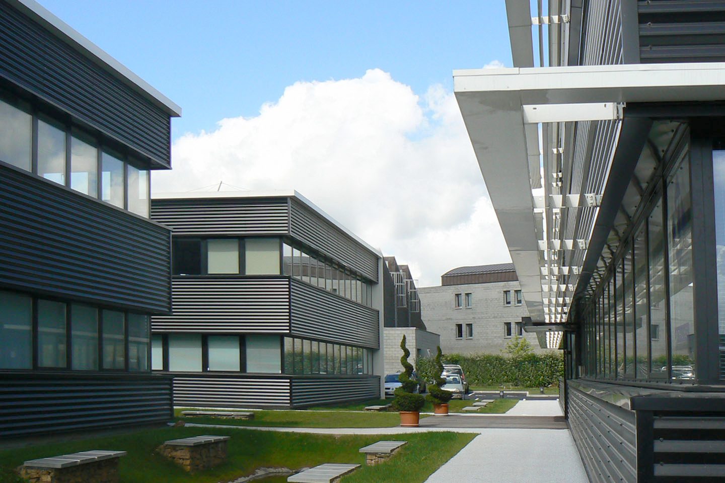 Intégré à la Zone Franche Urbaine Nantes St-Herblain, ce complexe de trois bâtiments de bureaux fait face à la voie principale, très passante. L’agence a donc mis l’accent sur une perception « en travelling » des bâtiments. La ligne blanche des pare-soleil, prenant naissance sur les pignons, s’étire sur les façades vues de la voie. Ces surfaces claires contrastent avec le traitement en bardage noir du cœur d’îlot, qui paraît d’autant plus central. L’aménagement paysager prend ici tout son sens : il crée la profondeur, régule les eaux pluviales et offre au piéton un cadre d’activité agréable.